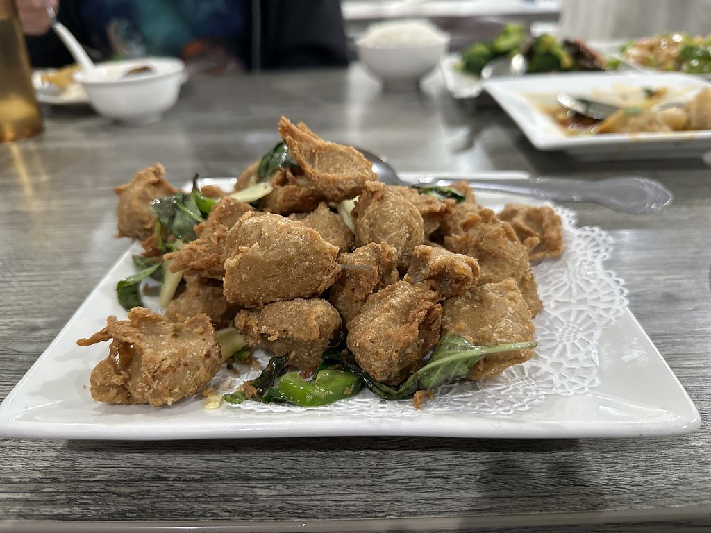 Vegan Meat Pancake, crispy mushrooms, eggplant & tofu pot, and vegan f…