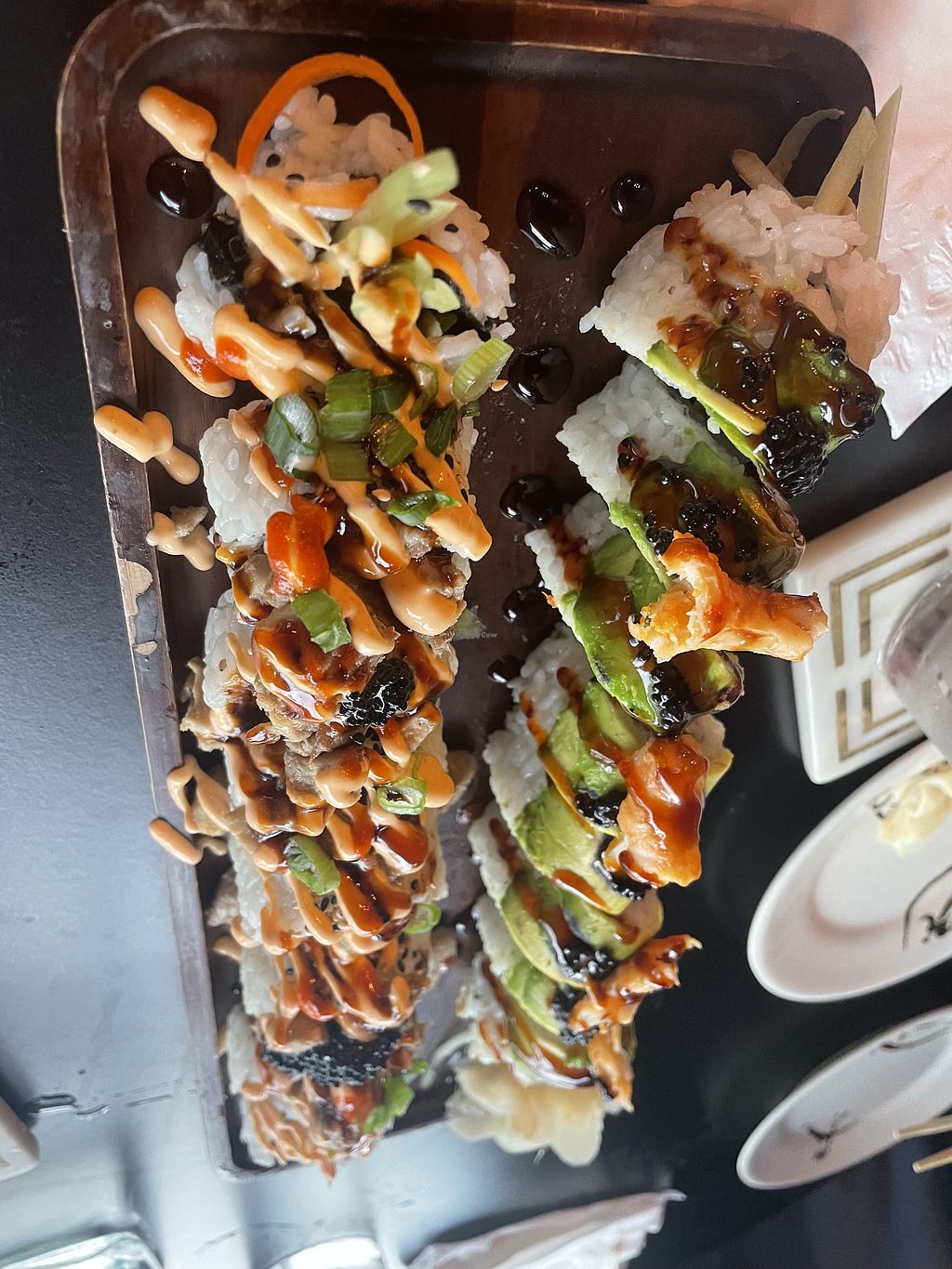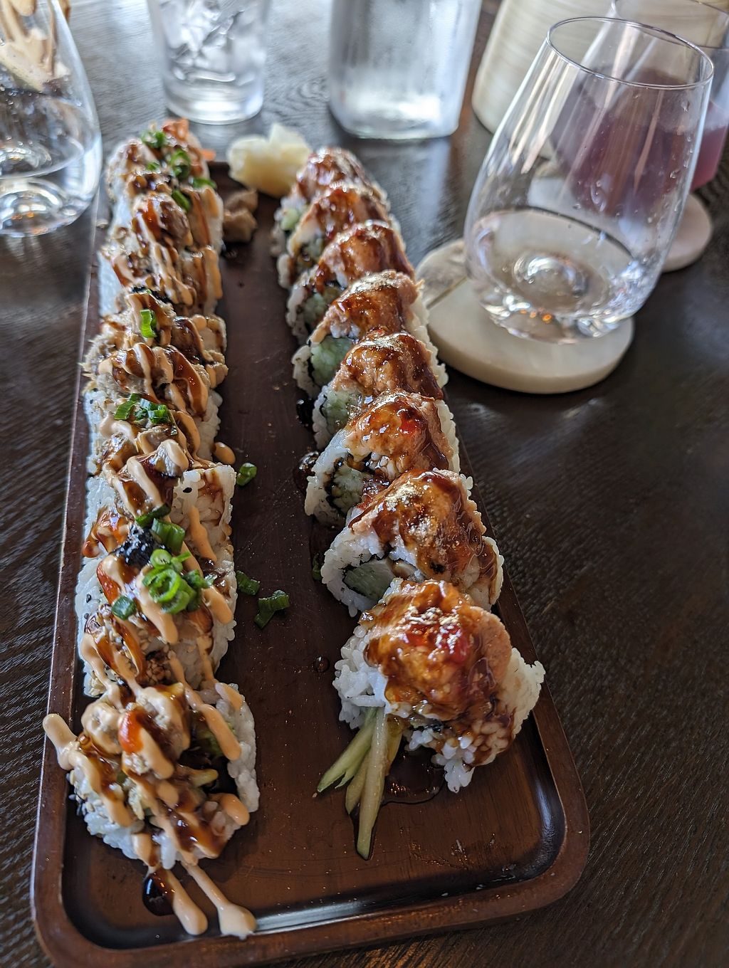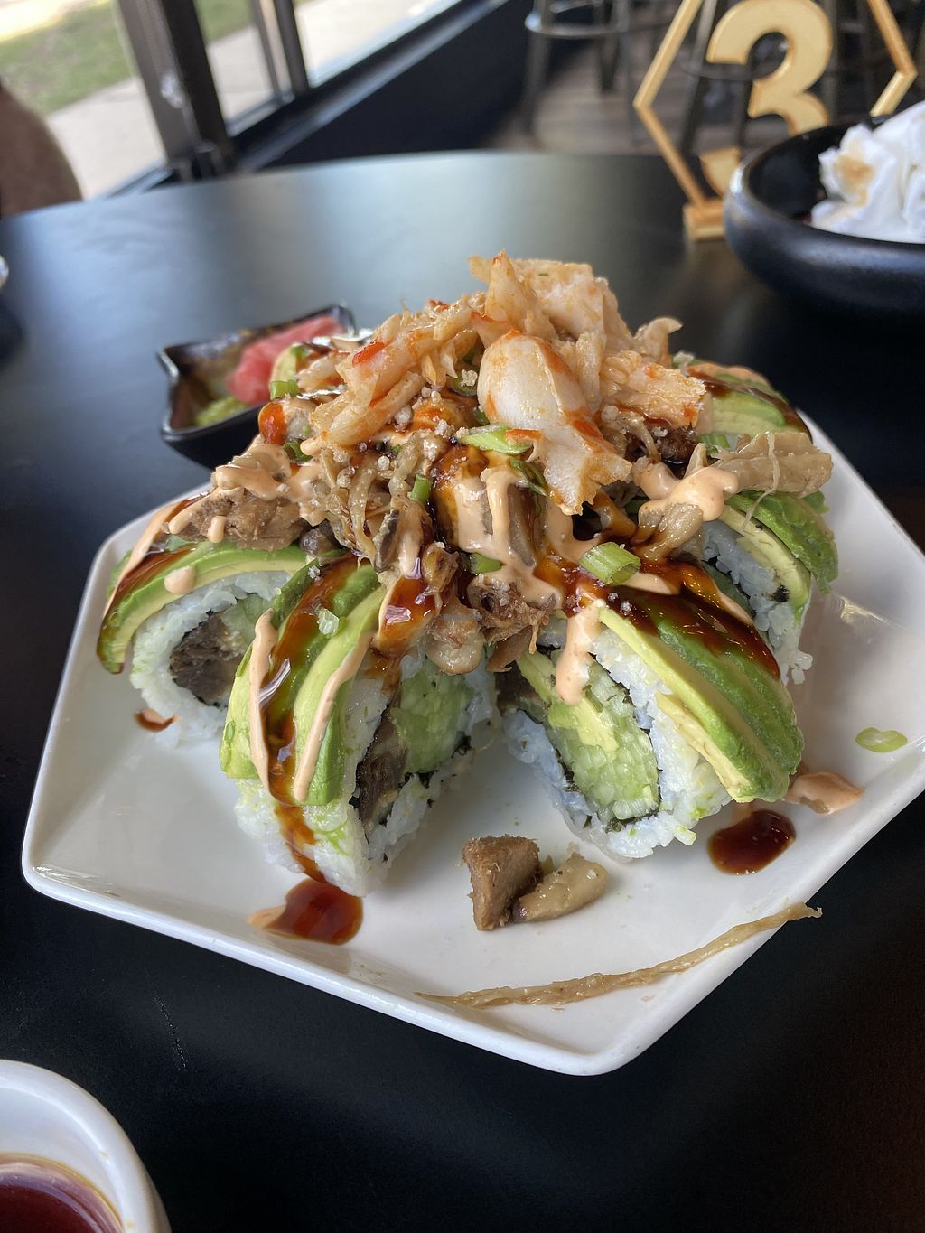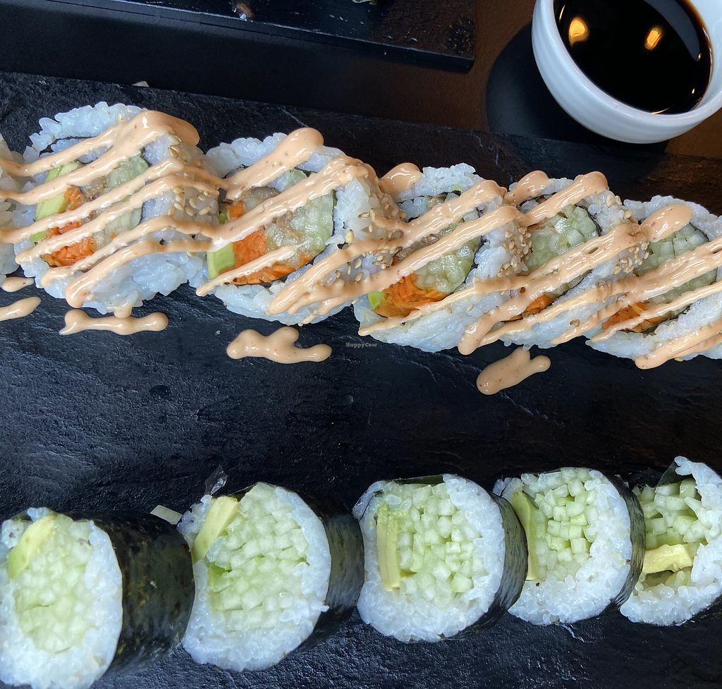 Spicy toona roll, scallop truffle nigiri, and tom kha ramen with vegan…