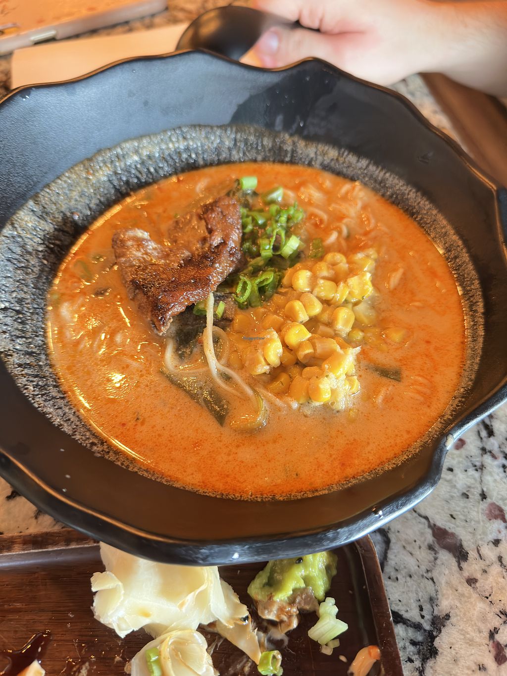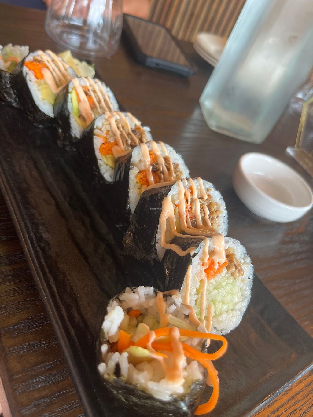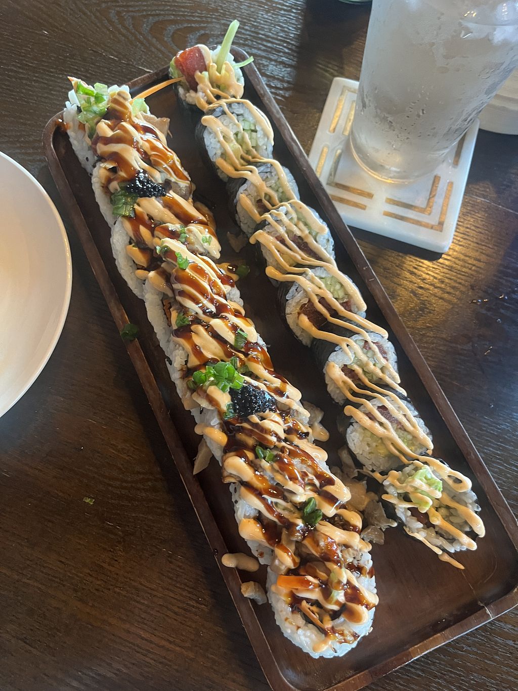 Spicy toona roll, scallop truffle nigiri, and tom kha ramen with vegan…