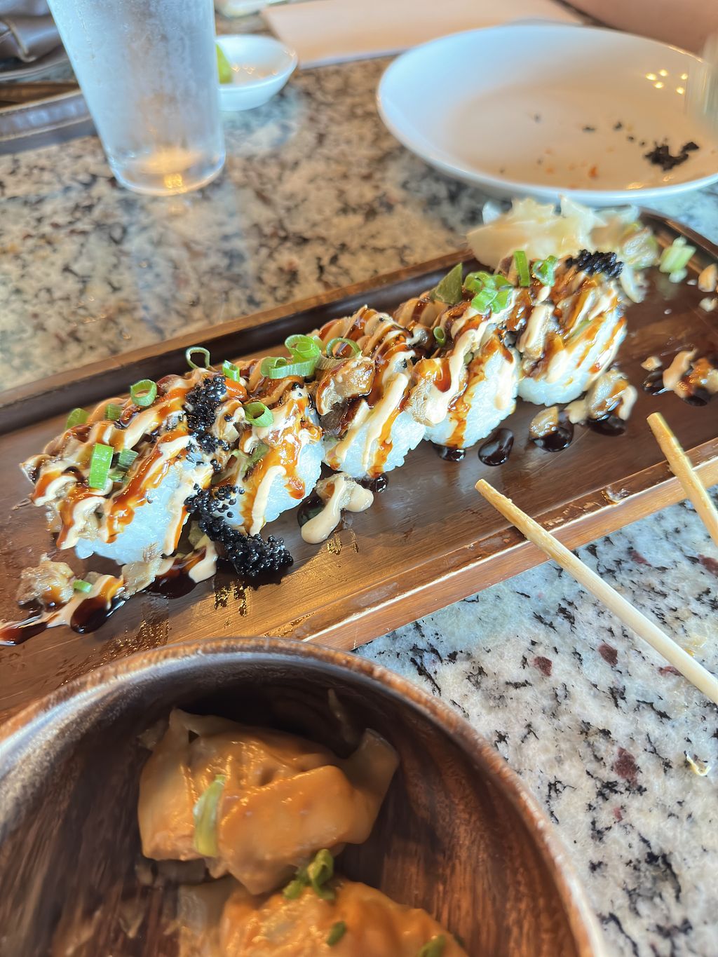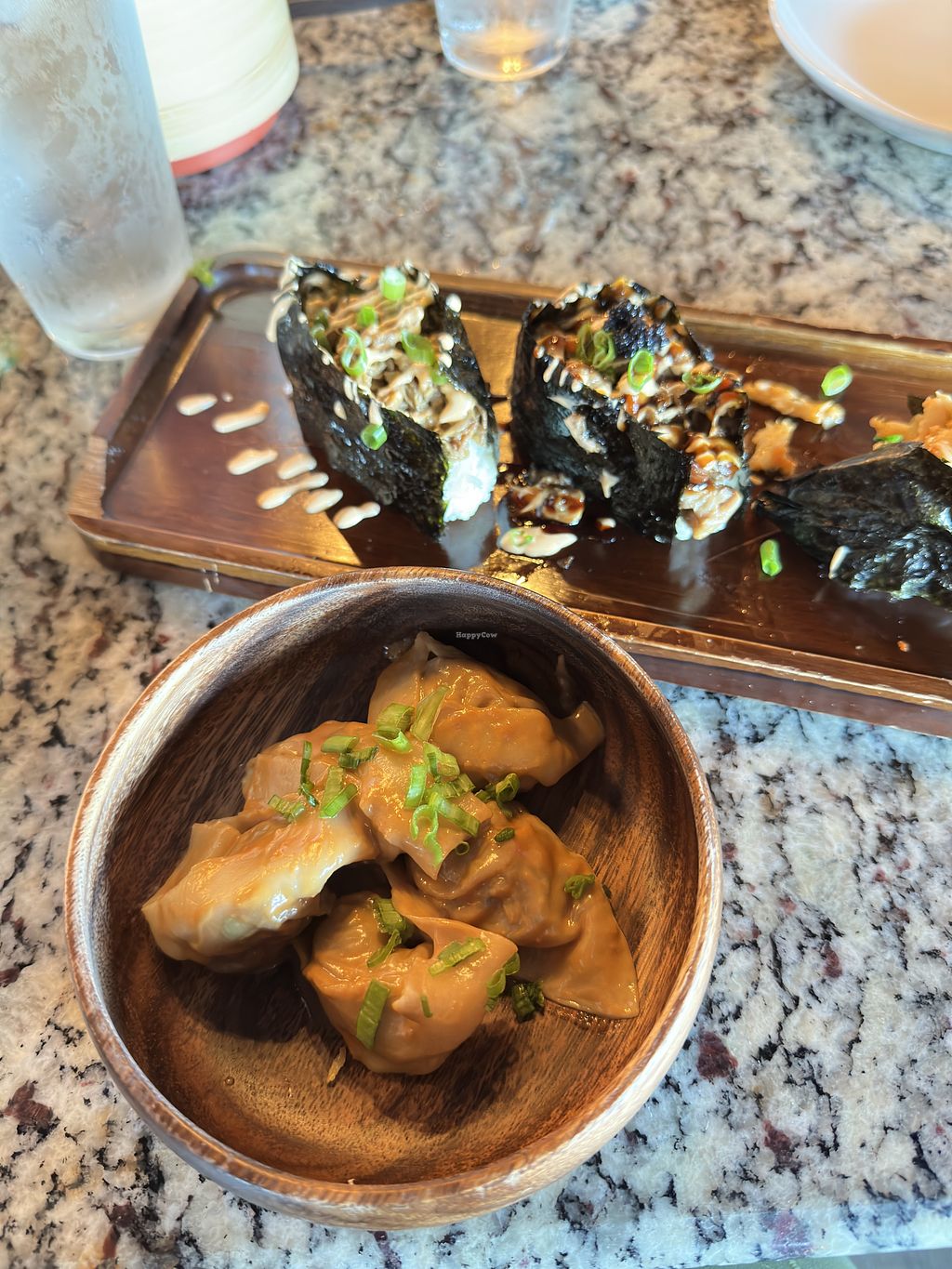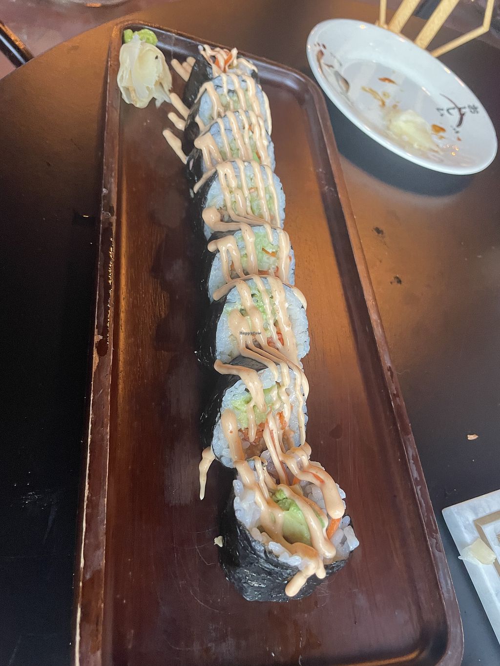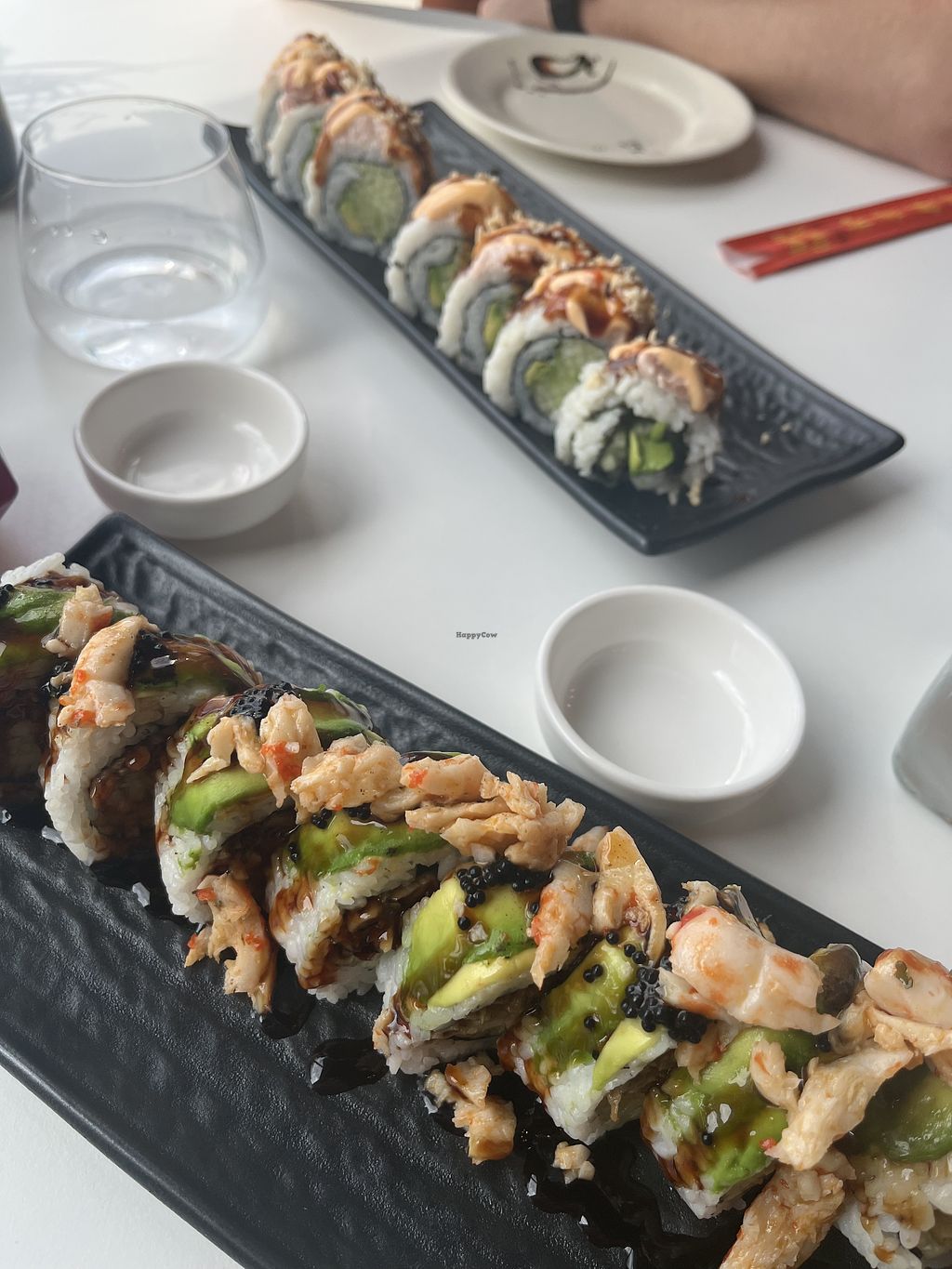 Spicy toona roll, scallop truffle nigiri, and tom kha ramen with vegan…