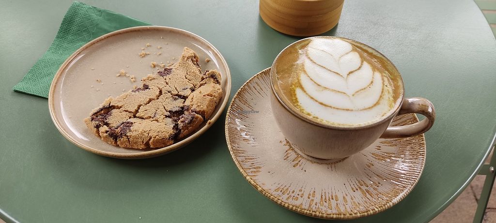 Nice place to get warm on a rainy day. First try of a matcha espresso latte. Not matcha should taste (what do i know), but it tasted great nonetheless...as did the chocolate chip cookie!