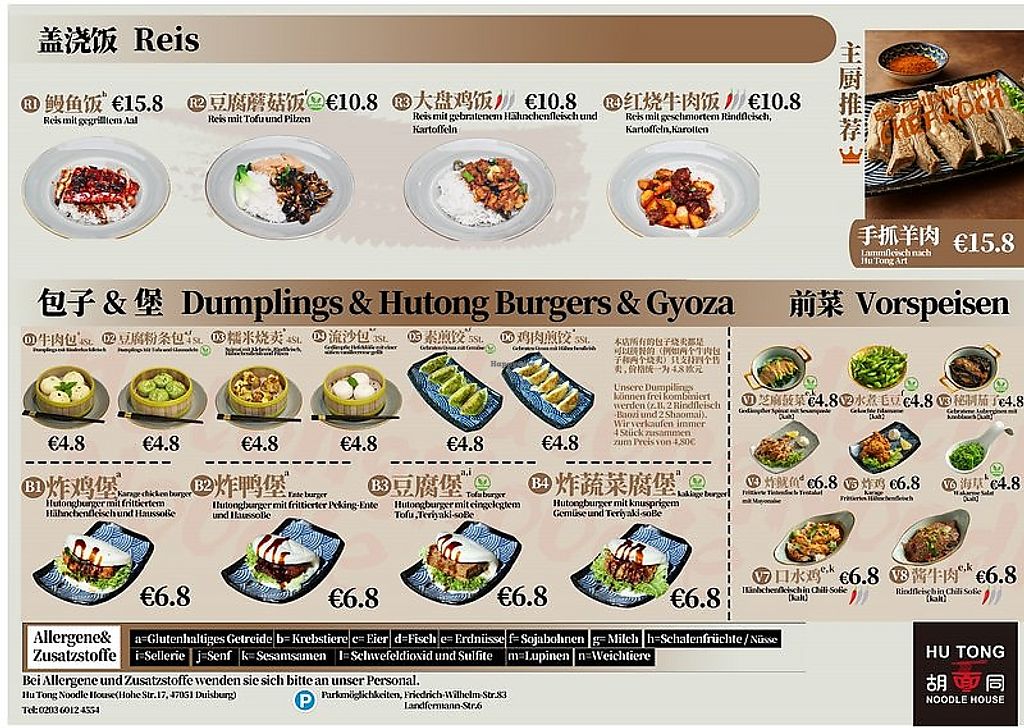 Serves meat, vegan options available. Traditionelle chinesische Gerichte – darunter handgezogene Nudeln, die frisch zubereitet werden u.a. Biang-Biang-Nudeln, Biang-Biang-Nudeln, Dumplings, Gyoza, Burger und verschiedene Vorspeisen. Open Mon 12:00-22:00, Tue-Sat 17:00-22:00, Sun 12:00-22:00.