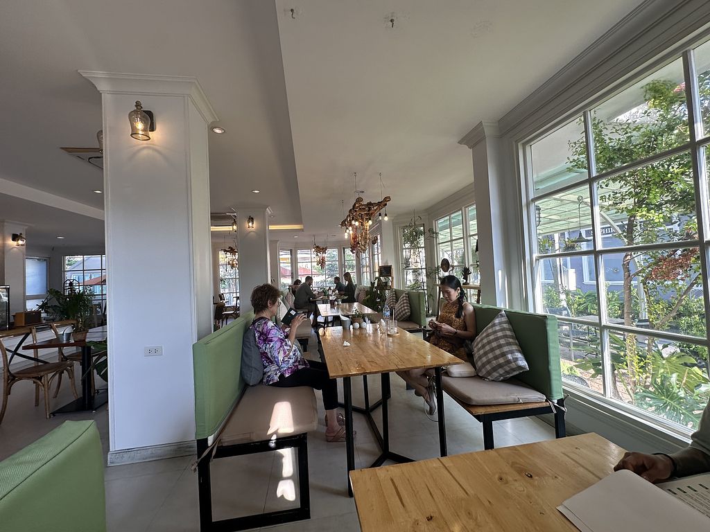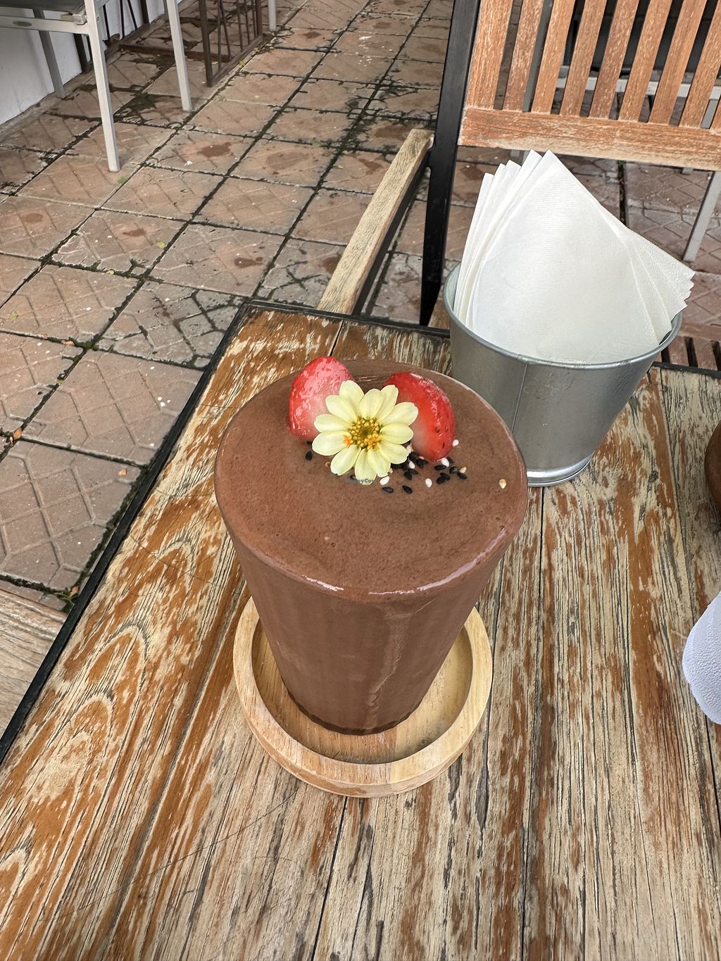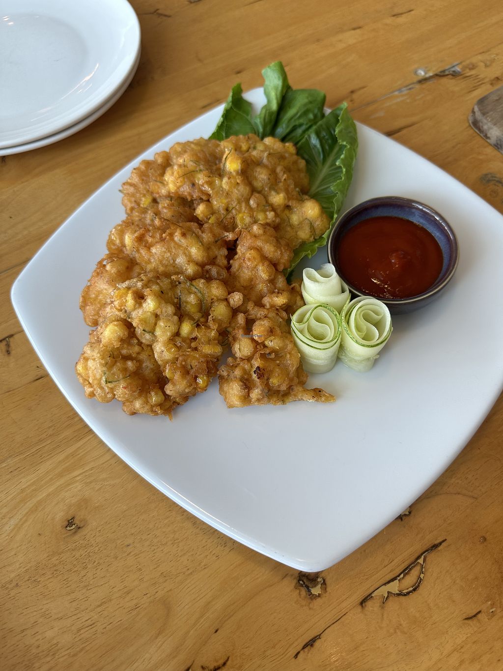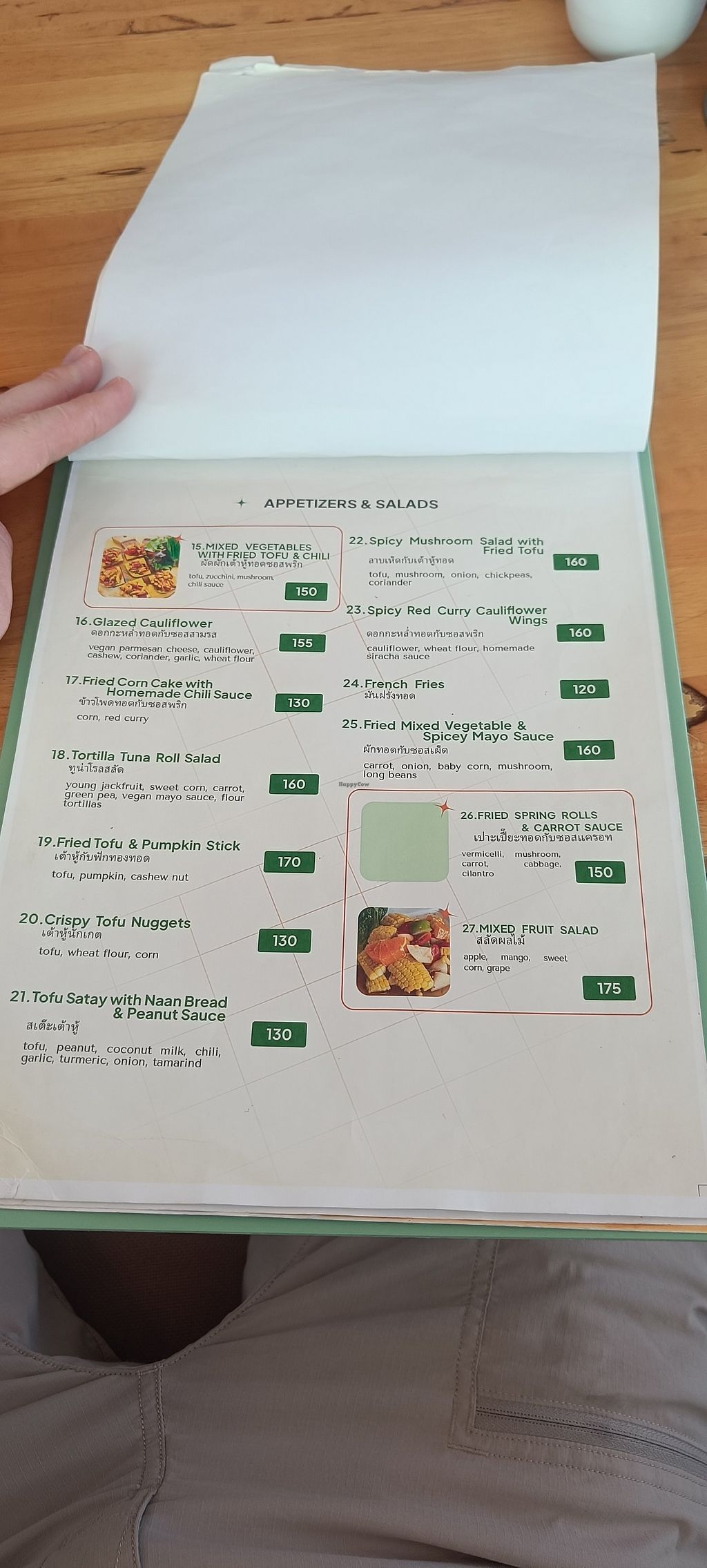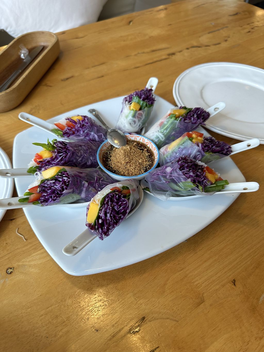 Mango spring rolls with almond butter dipping sauce, 160 baht