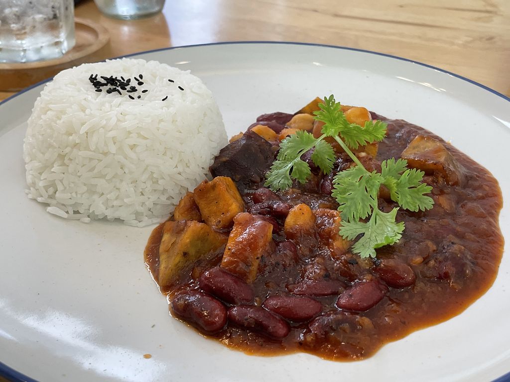 Mixed red curry with chickpeas, red beans and sweet potato over rice, …