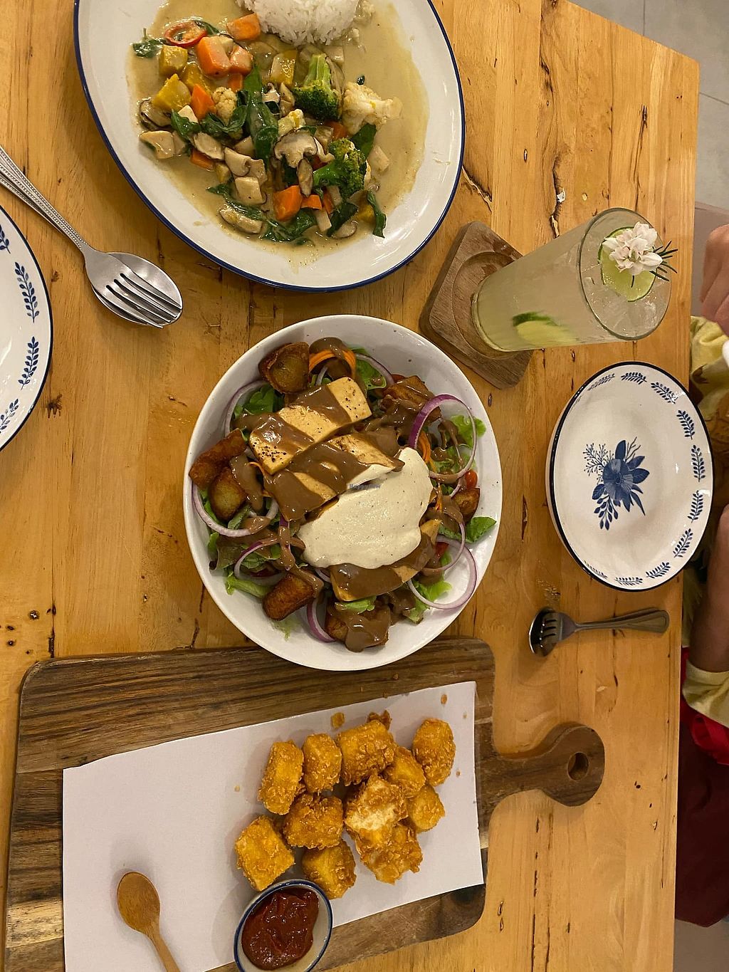 Green Curry vegetables, creamy cashew salad, tofu nuggets