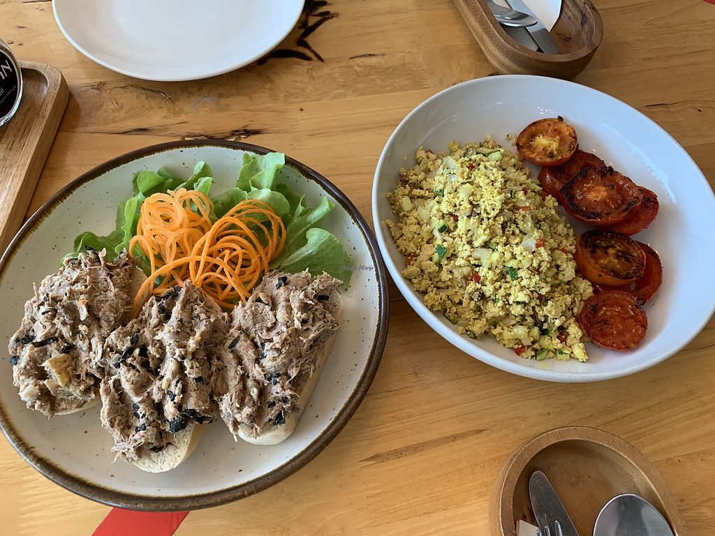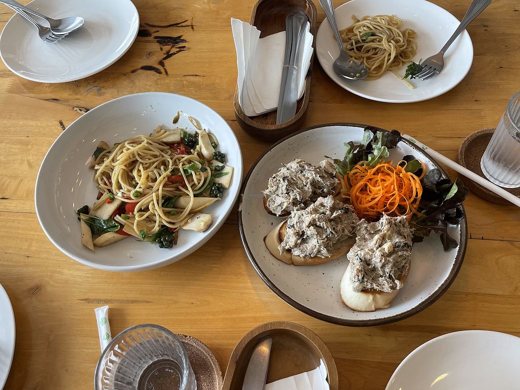 Jackfruit tuna melt and spaghetti with spicy mushrooms