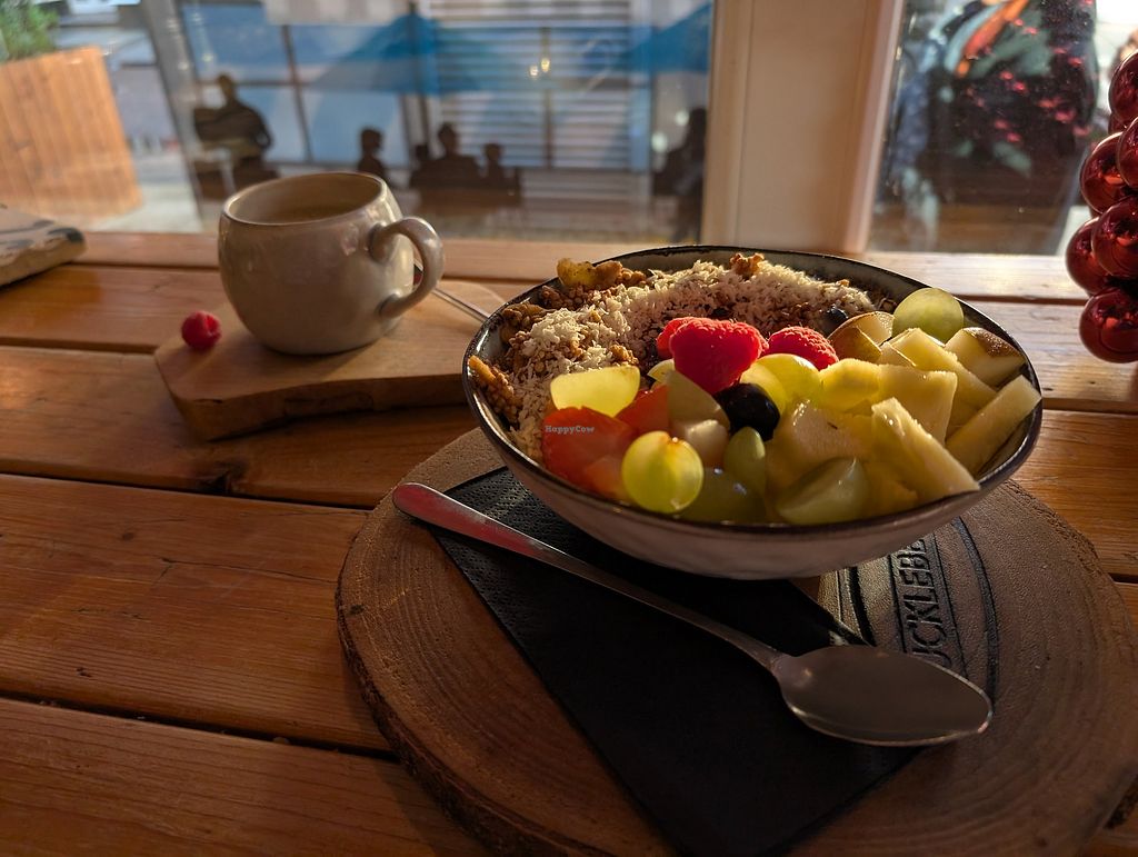 Bread with hummus/avocado & porridge was great. Coffee very tasty and available with various plant based alternatives.