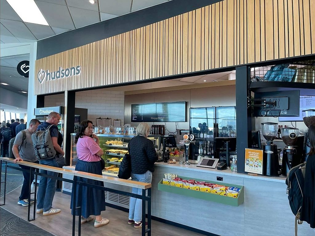 Serves meat, vegan options available. Located airside in the domestic terminal after security by Gate 30. Offers plant milks for hot and cold drinks, smoothies, vegan nachos, wraps, a muesli slice, fresh fruit, and vegan snacks such as popcorn. Guests can choose to dine in at tables and chairs or take away. Open Mon-Sun 5:00am-8:00pm.