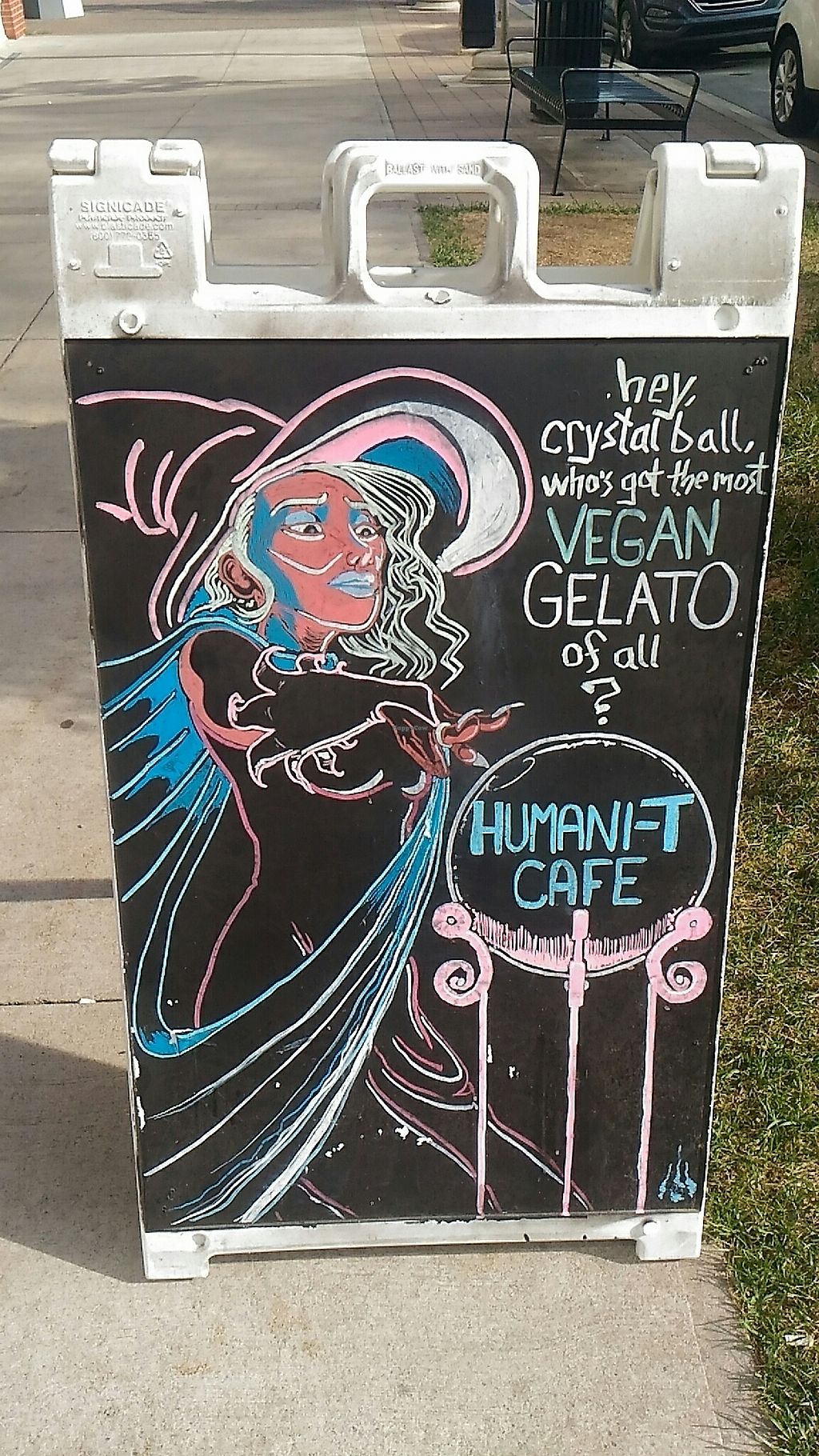 Humani-T has vegan gelato! The staff very clearly marks which flavours are vegan and there is always at least one vegan option. The gelato choices are more limited in the winter because apparently not as many people are fools like me who want cold food when its cold outside.