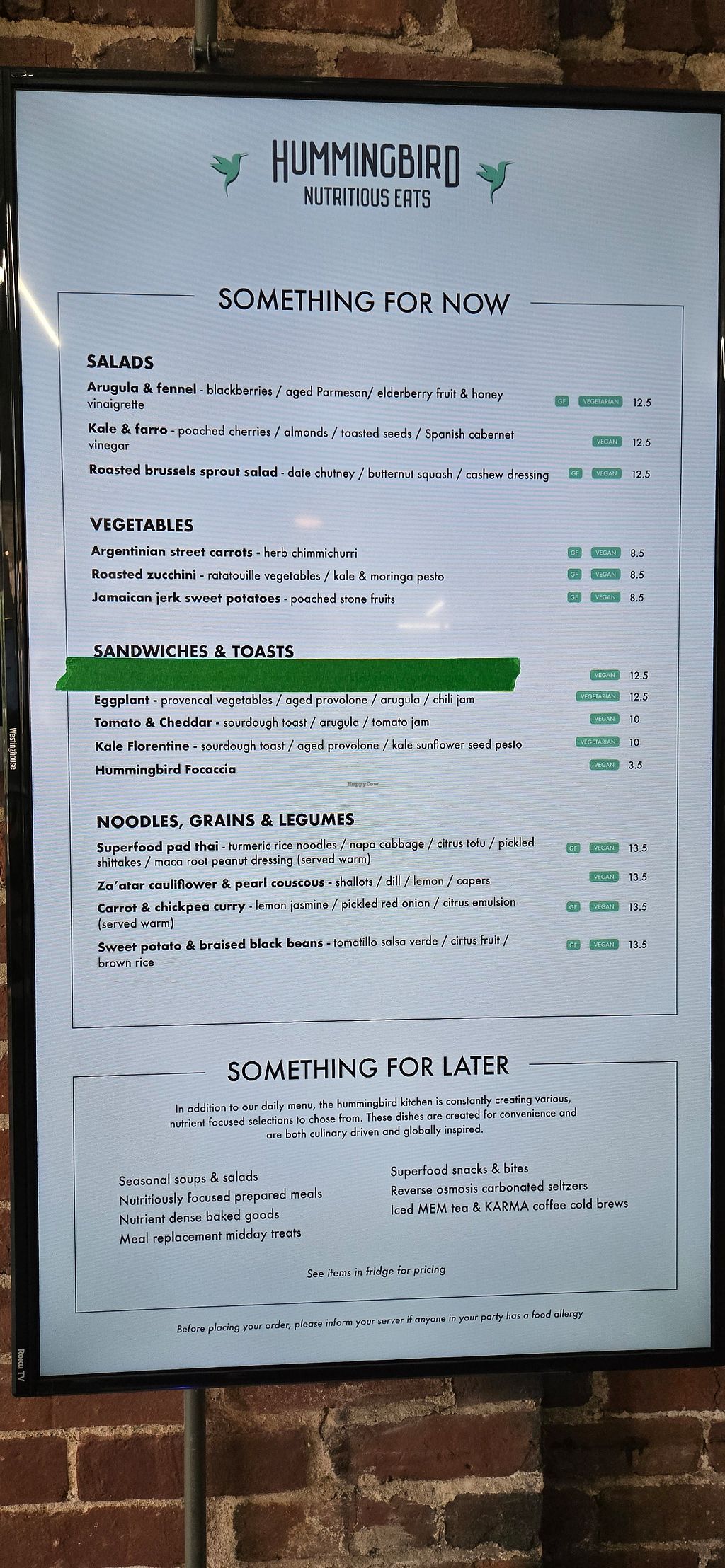 Recently, Hummingbird has shifted focus to take out and events almost exclusively. The only item made fresh is the KFC (Korean Fried Cauliflower). It's a fantastic sandwich, but I miss when there were other options to dine in.