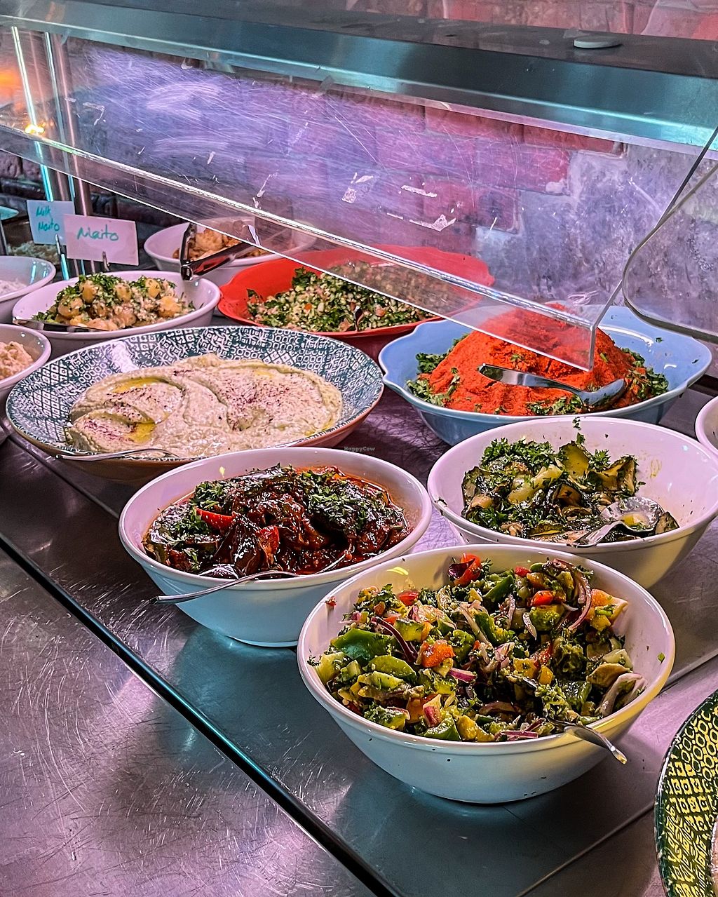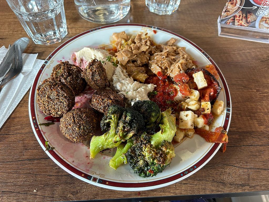 Serves meat, vegan options available. Palestinian restaurant with a predominantly vegetarian lunch buffet. Items include hummus, tahini based dips, baba ganoush, salads and warm dishes. Please some sauce/dips may contain dairy - ask staff. Reported closed April 2025.