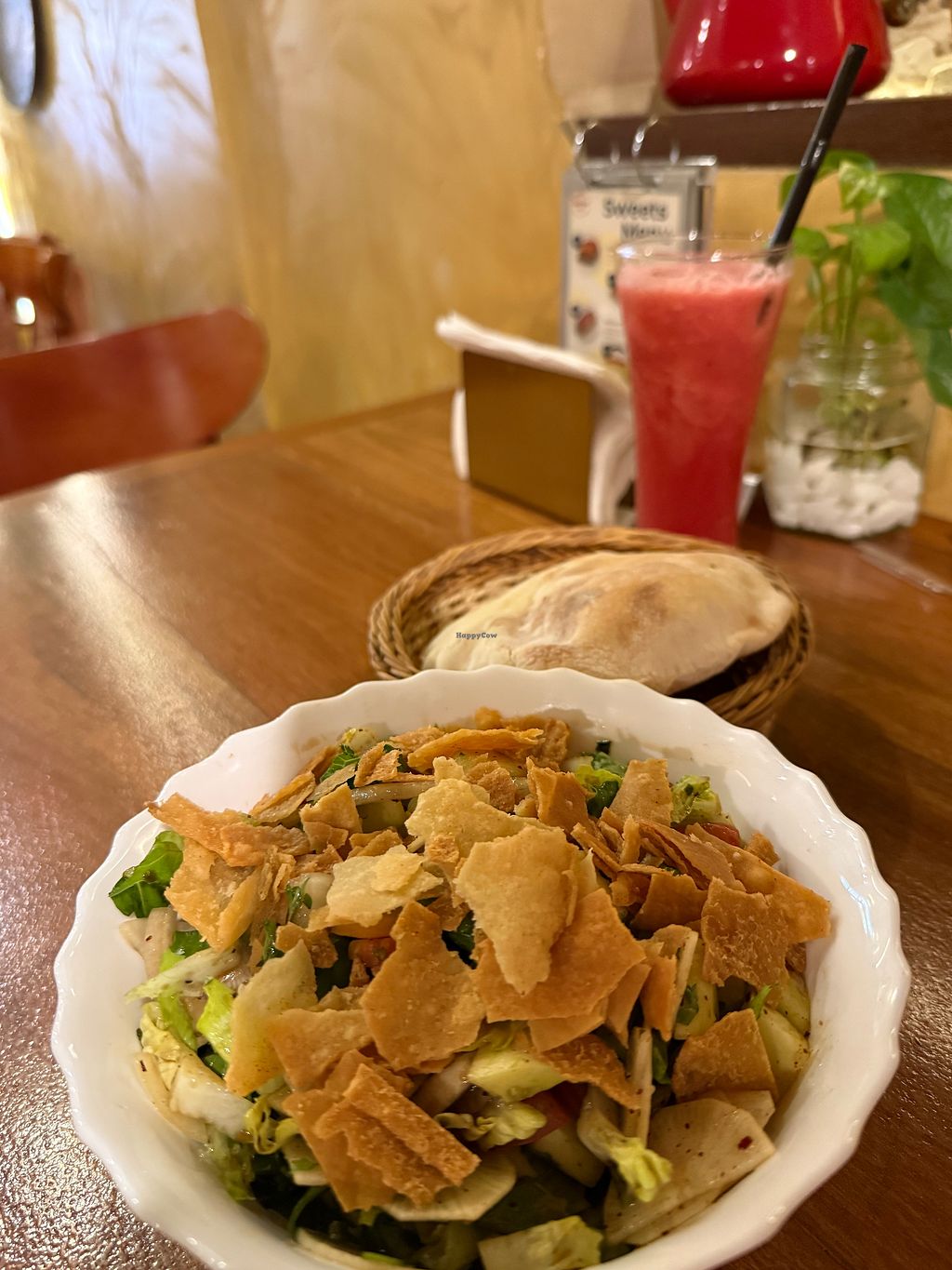 I loved it here! Had the moussaka and the falafel salad. Both come with pita bread. The portions were big and staff is super friendly. They even gave me a baklava for free! It has great options for vegans and vegetarians. Prices are a bit higher than normally in the area, but imo totally worth it!! Wish I could give 5 stars, but it's not fully veggie.