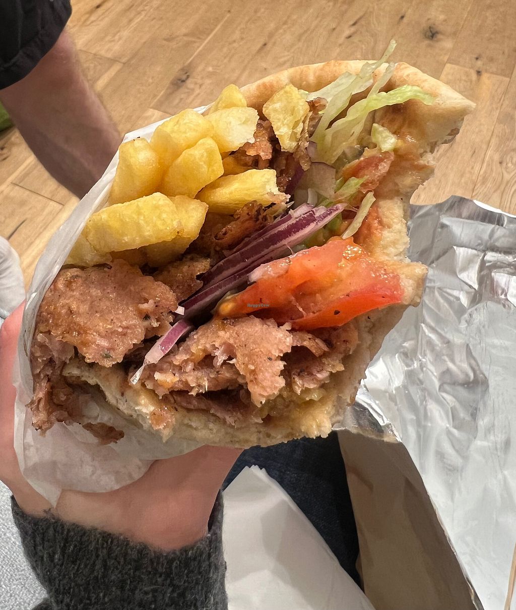 Got a vegan wrap which includes a vegan meat thing made of chickpeas, salad, chips and an aubergine spread. It was tasty although a bit too lemony and could have benefited from a creamy sauce like a mayo or vegan tzatziki, but overall quite yummy!