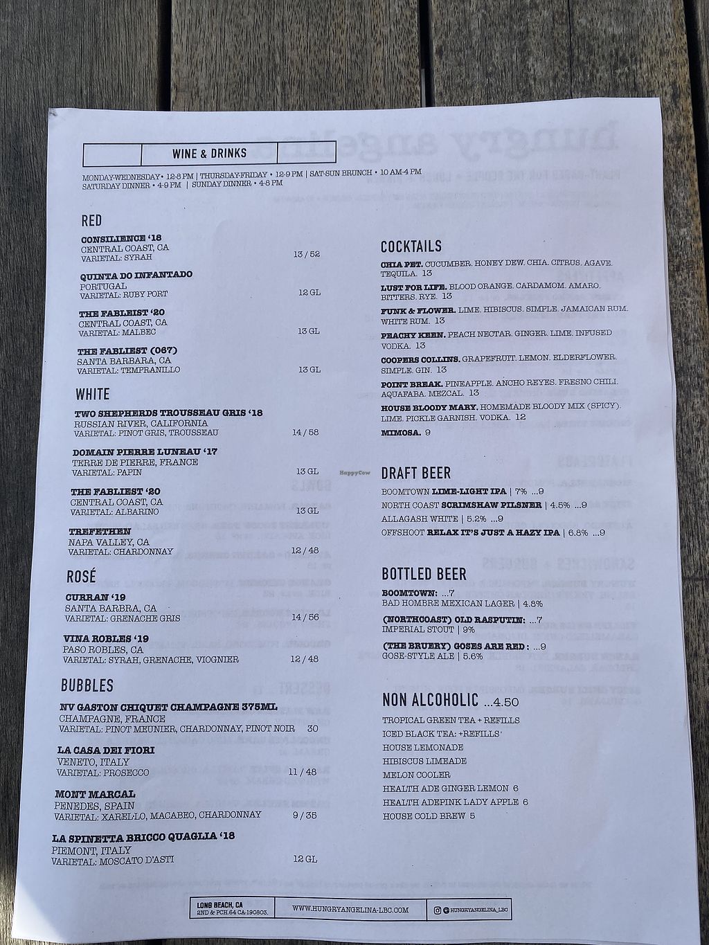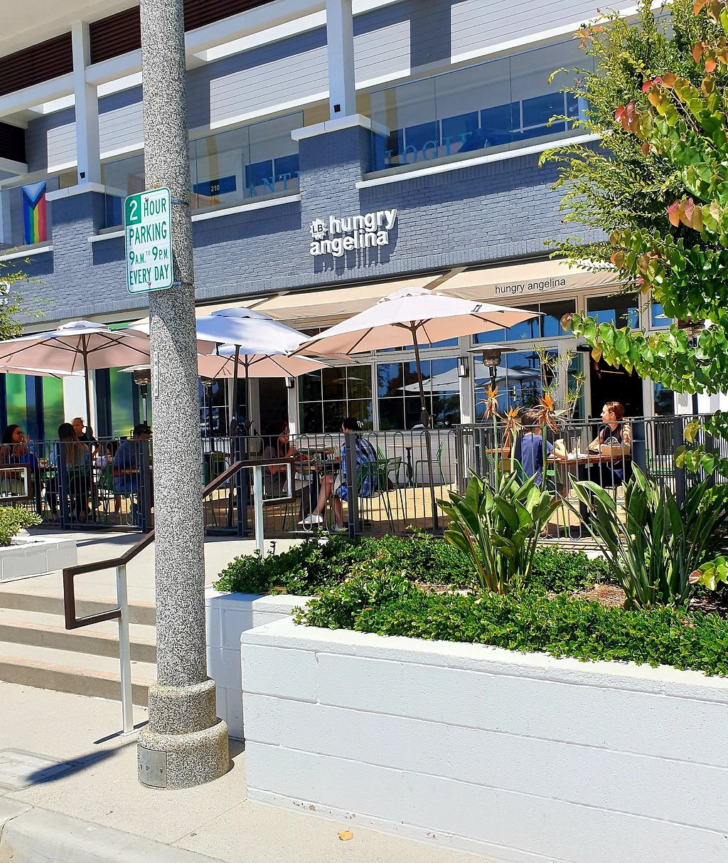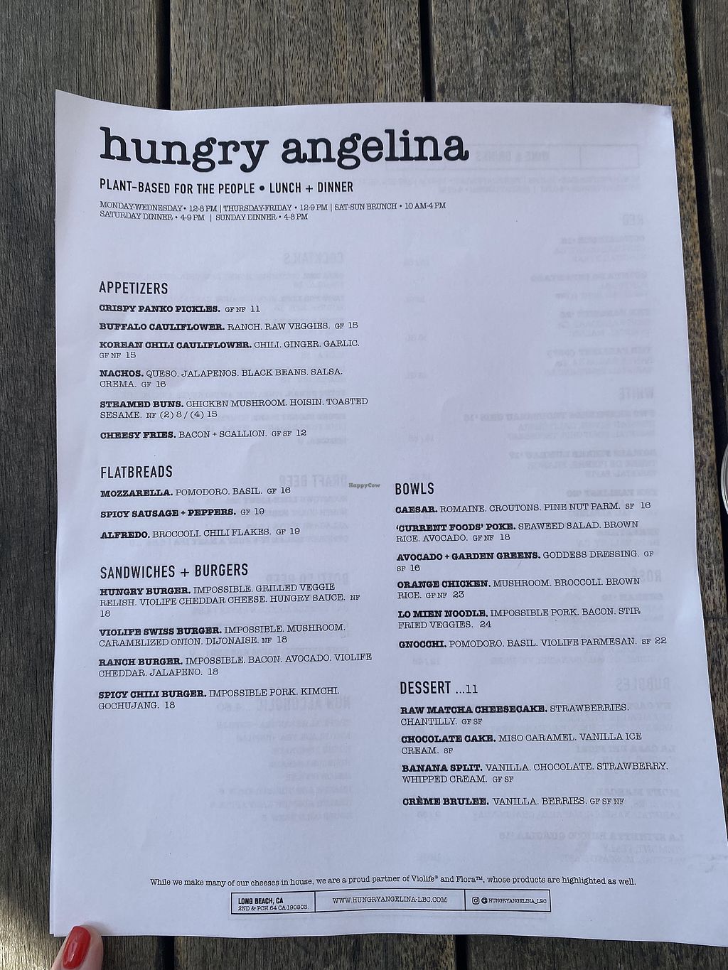 My friend and I went here today. Hungry Angelina's is in Long Beach near Seaport and PCH across from the yacht harbor. It was a lovely sunny, breezy day, and we ate on the very pleasant patio out in front distanced nicely from other diners. The food we chose was exceptional. The bloody Mary was great! Sorry for the half eaten food, but I forgot to take pictures until I we had already eaten a lot of it. My friend had the hash, which was fantastic!! I had Pesto Primavera Flatbread with veggies, pistachio pesto, and macadamia ricotta. I have to say the ricotta was good, but there was too much of it. The hash was made with sweetpotato, onion, peppers, tempeh bacon, JUST Egg, and a large avocado half. I got a taste of it and loved it. The portions are large, the drinks are tall, and the service on the patio in front was great. All the menu items looks really good. The ingredients we experienced were flavorful and fresh. I will go back here again many times. Next time I'm getting the hash!