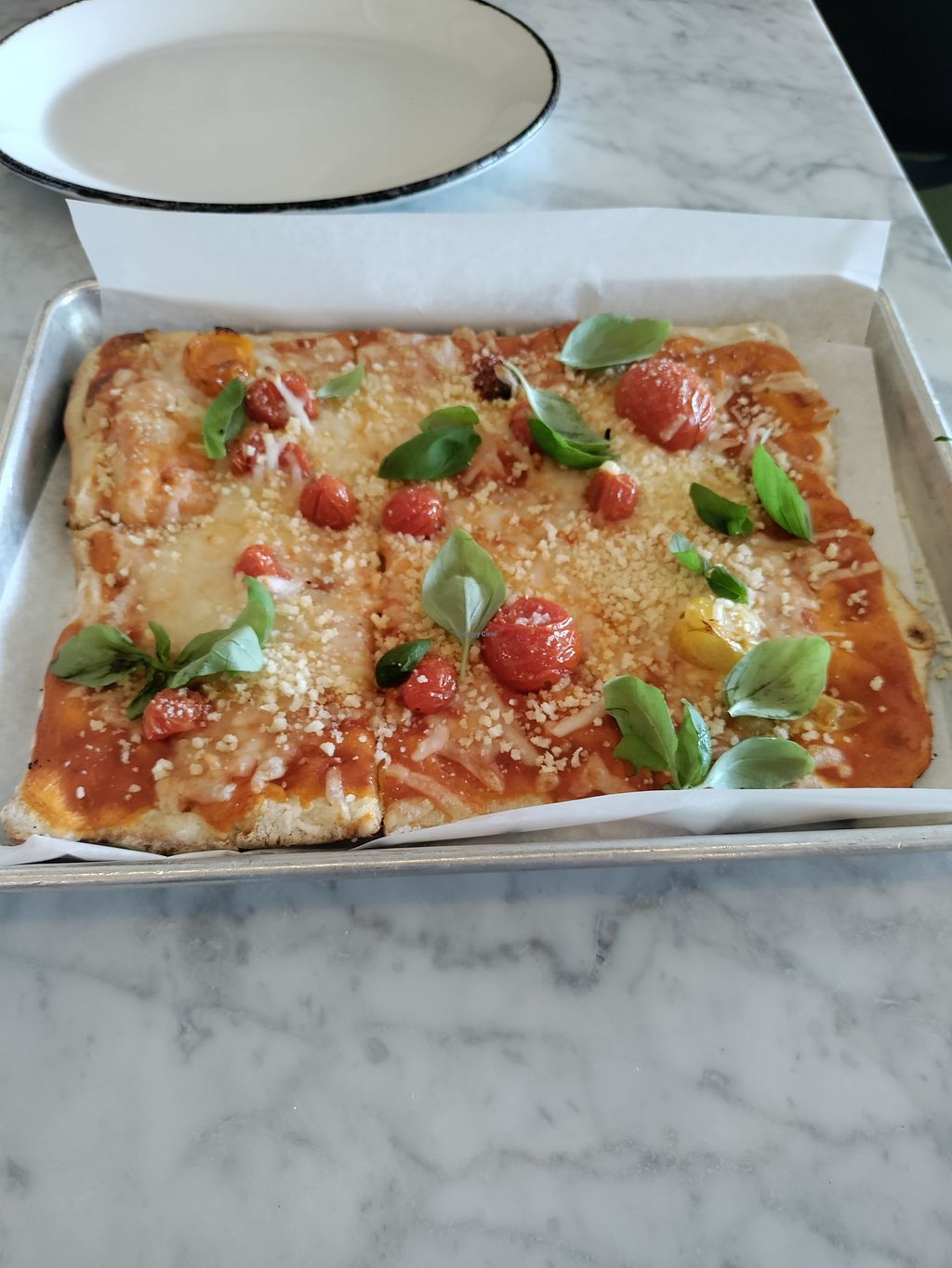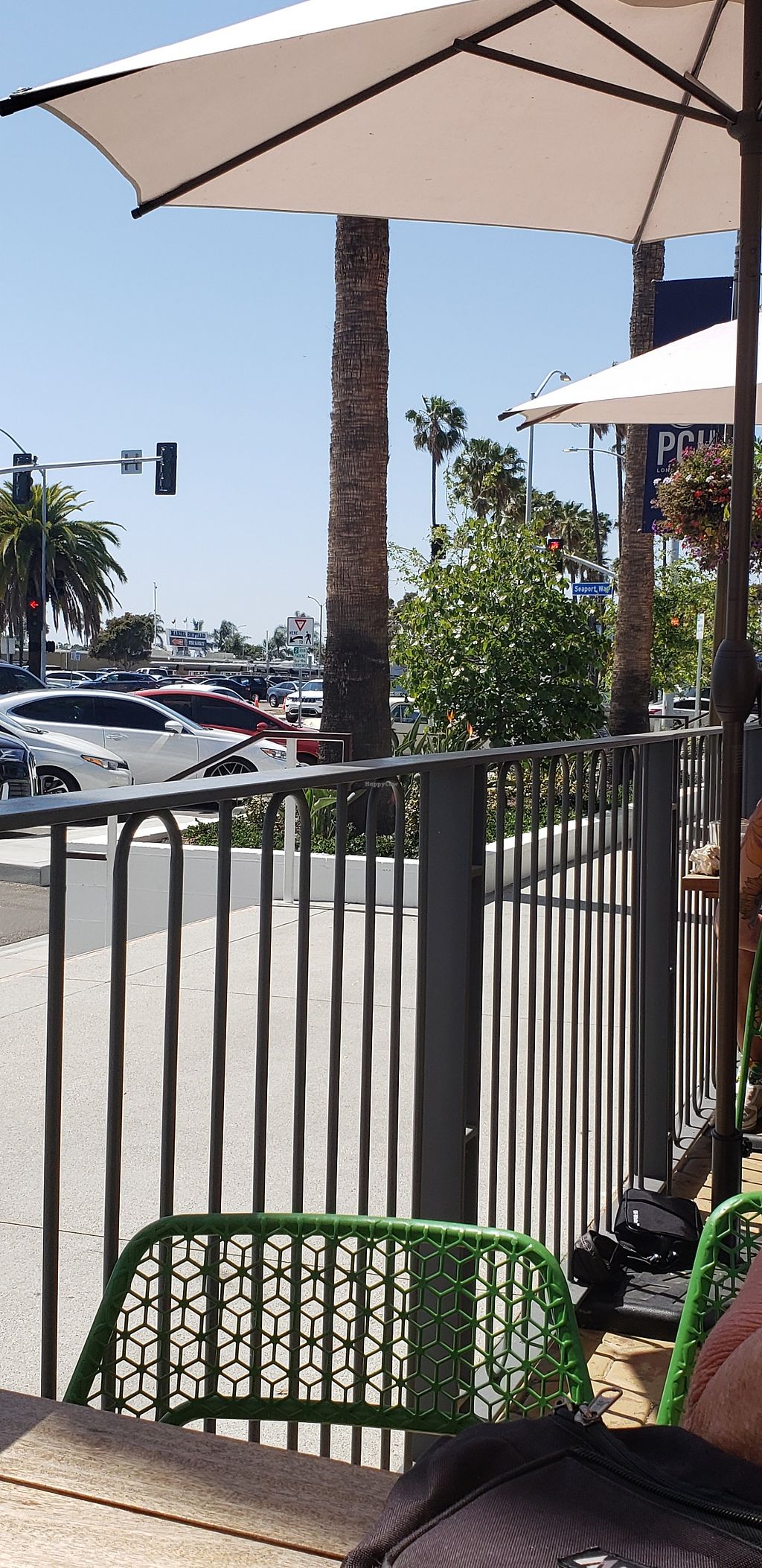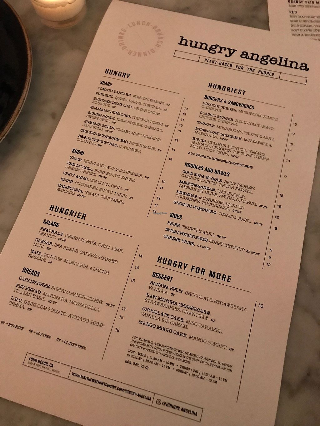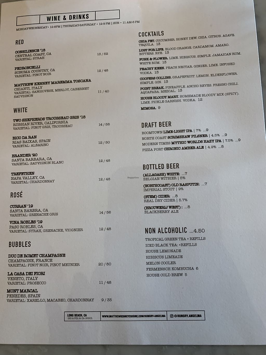 My friend and I went here today. Hungry Angelina's is in Long Beach near Seaport and PCH across from the yacht harbor. It was a lovely sunny, breezy day, and we ate on the very pleasant patio out in front distanced nicely from other diners. The food we chose was exceptional. The bloody Mary was great! Sorry for the half eaten food, but I forgot to take pictures until I we had already eaten a lot of it. My friend had the hash, which was fantastic!! I had Pesto Primavera Flatbread with veggies, pistachio pesto, and macadamia ricotta. I have to say the ricotta was good, but there was too much of it. The hash was made with sweetpotato, onion, peppers, tempeh bacon, JUST Egg, and a large avocado half. I got a taste of it and loved it. The portions are large, the drinks are tall, and the service on the patio in front was great. All the menu items looks really good. The ingredients we experienced were flavorful and fresh. I will go back here again many times. Next time I'm getting the hash!