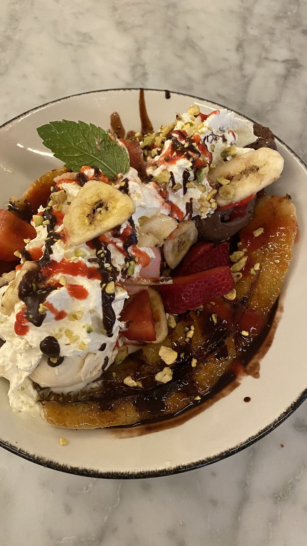 I love vegan junk food, so I had to try the fried pickles & the banana split! Both were so good, love the dip the pickles came with and the banana split had caramelized bananas. Also tried the Steamed Buns, Sausage Pizza, Caesar Salad, & Patty Melt, also really tasty! The portions are huge and meant to share, definitely over-ordered with 3 people. Staff was attentive. Parking structure in the mall.
