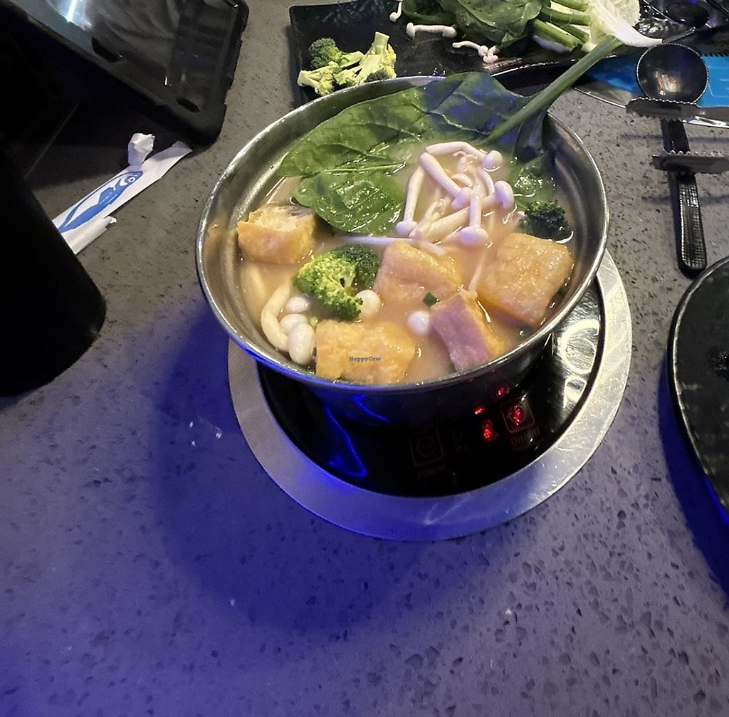 I go here very often with friends!! I always get miso soup & add siracha. I typically get rice cakes, fried tofu, and some veggies! vegan spring rolls are also very good! everyone gets their own separate soup base, so your non-veg friends can get meat if that’s something that matters when going out!