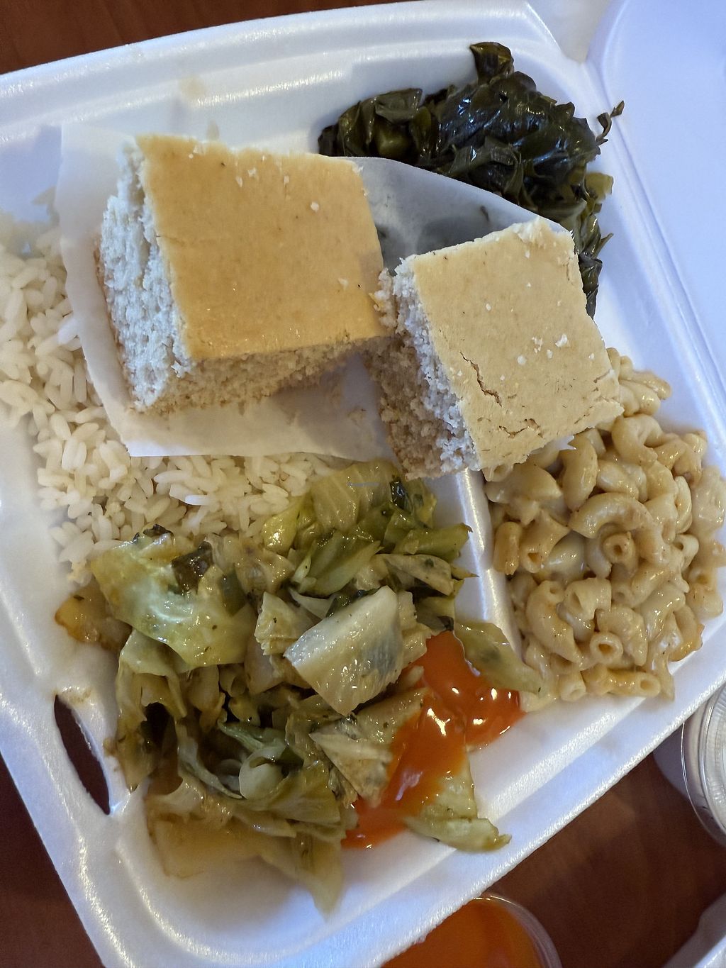 Salisbury steak, mac n cheese, potatoes and cornbread.