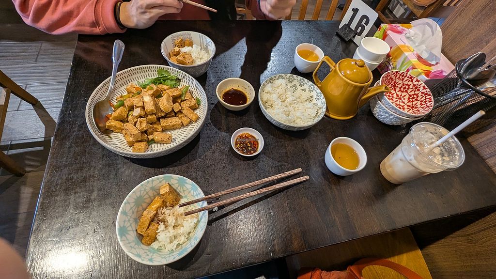 There’s lots of indoor seating and we like sitting near the window to watch what’s going on in the street. There’s a big television on all the time which we would prefer not to have. Staff are friendly and willing to change mock meat to tofu as is my preference (except for the incredibly delicious crispy mock chicken mentioned above). There are sometimes minor issues (like forget to bring an extra glasses for water when another person arrives at table).