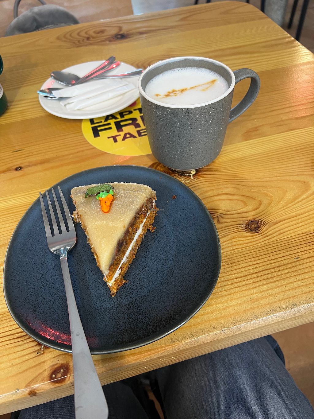 I had a vegan carrot cake, latte with coconut milk, and matcha latte with oat milk. They were pretty delicious. There also was a vegan banana bread, which I didn’t order but seemed okay.
