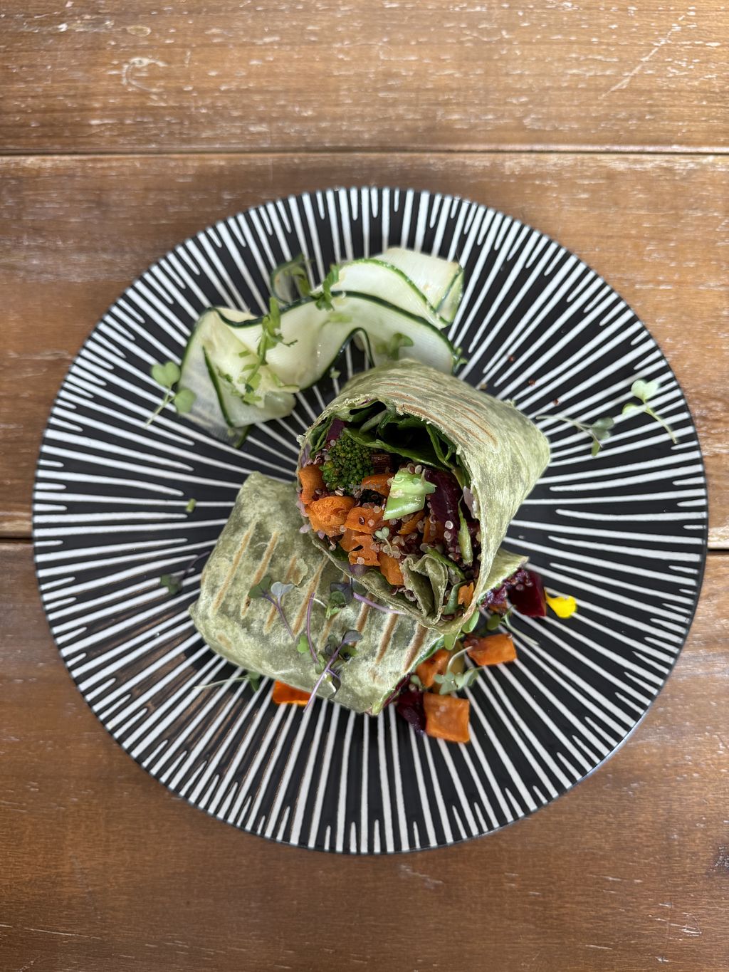 Smoothie bowl, toast with houmous and vegan feta, health shot, everyth…