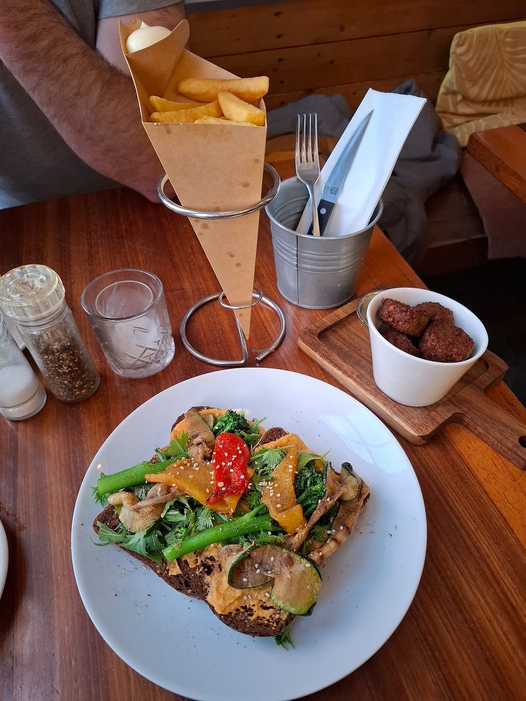 Read moreZe hebben echter een losse vegan kaart, hier kun je naar vragen. Ze doen al best veel standaard vegan (denk aan sausjes enz), maar hebben ook wel redelijk wat vis en vleesgerechten. Wij hadden brood met gegrilde groenten (HEEL LEKKER), puntzak frites met vegan mayo en de falafelballetjes. Koekje bij de koffie/thee was helaas niet vegan, dit kunnen ze nog verbeteren. Maar verder erg tevreden.