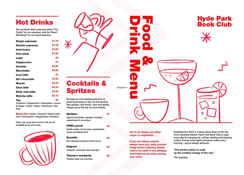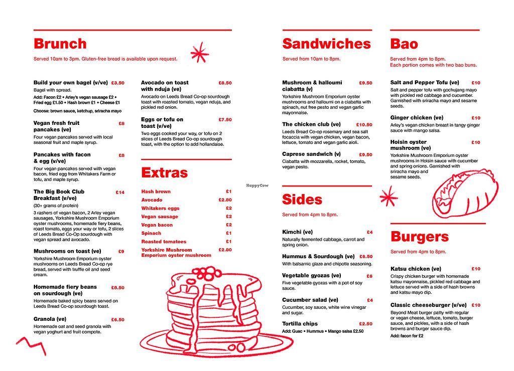 Coffee, arts, music, food, drinks, performance space based in Hyde Park, Leeds. Vegetarian menu, includes an extensive vegan range of fake meats from the Vegetarian Butcher of The Netherlands. Breakfast served until 5pm. Has a vegan brunch and evening menu. Brunch from 10 am-3.30 pm Mon-Sat, 10am-6pm Sun. Evening menu 4pm Mon-Sat & from 6pm Sun. Open Mon-Thu 09:00-00:00, Fri-Sat 09:00-01:00, Sun 09:00-00:00.