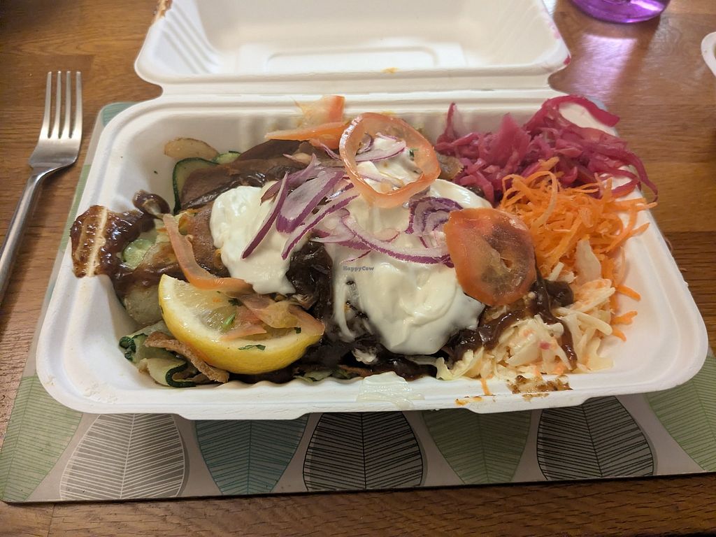 Voner Seitan Box with salad base, Korean BBQ sauce, vegan mayo, and no…