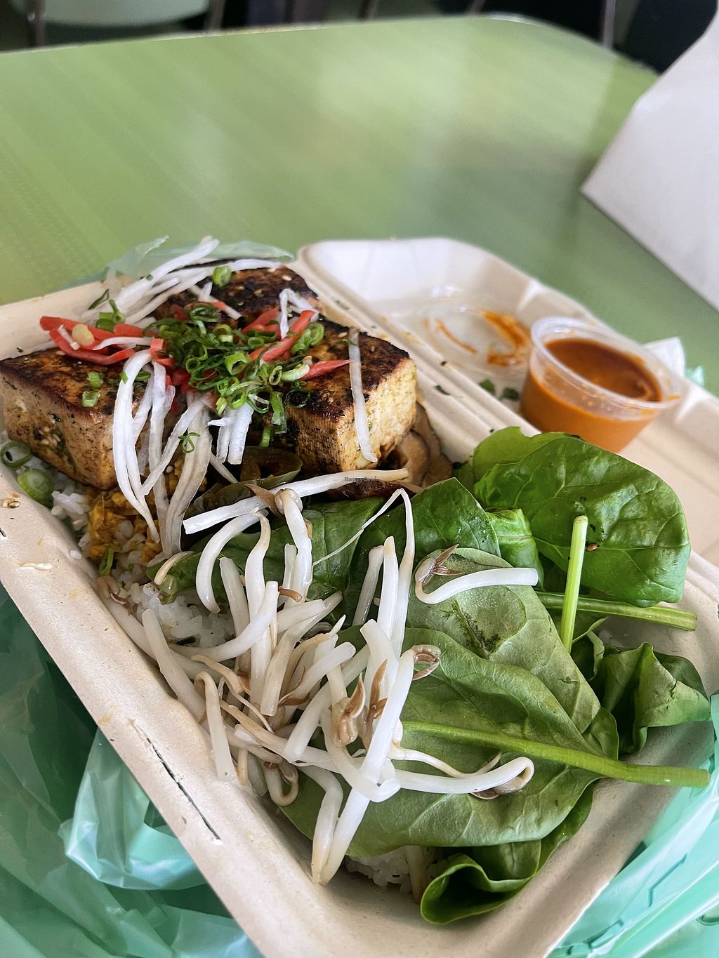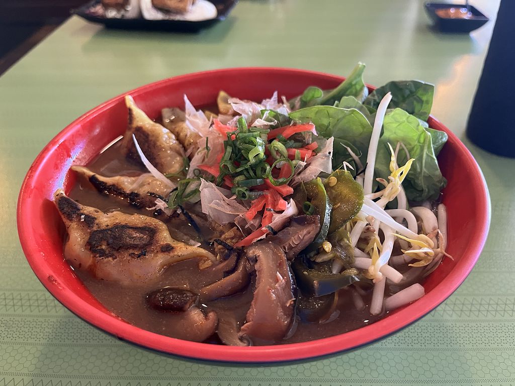 Nice vegetarian menu mix; rice and noodle bowls, steamed bun, cold salad, smoked flavor. Gluten-free. I had their gyoza bowl with fury sauce, enjoyable, lots of rice, 3 big gyoza, and flavor without obvious sugar. Casual space with limited seating inside and out.