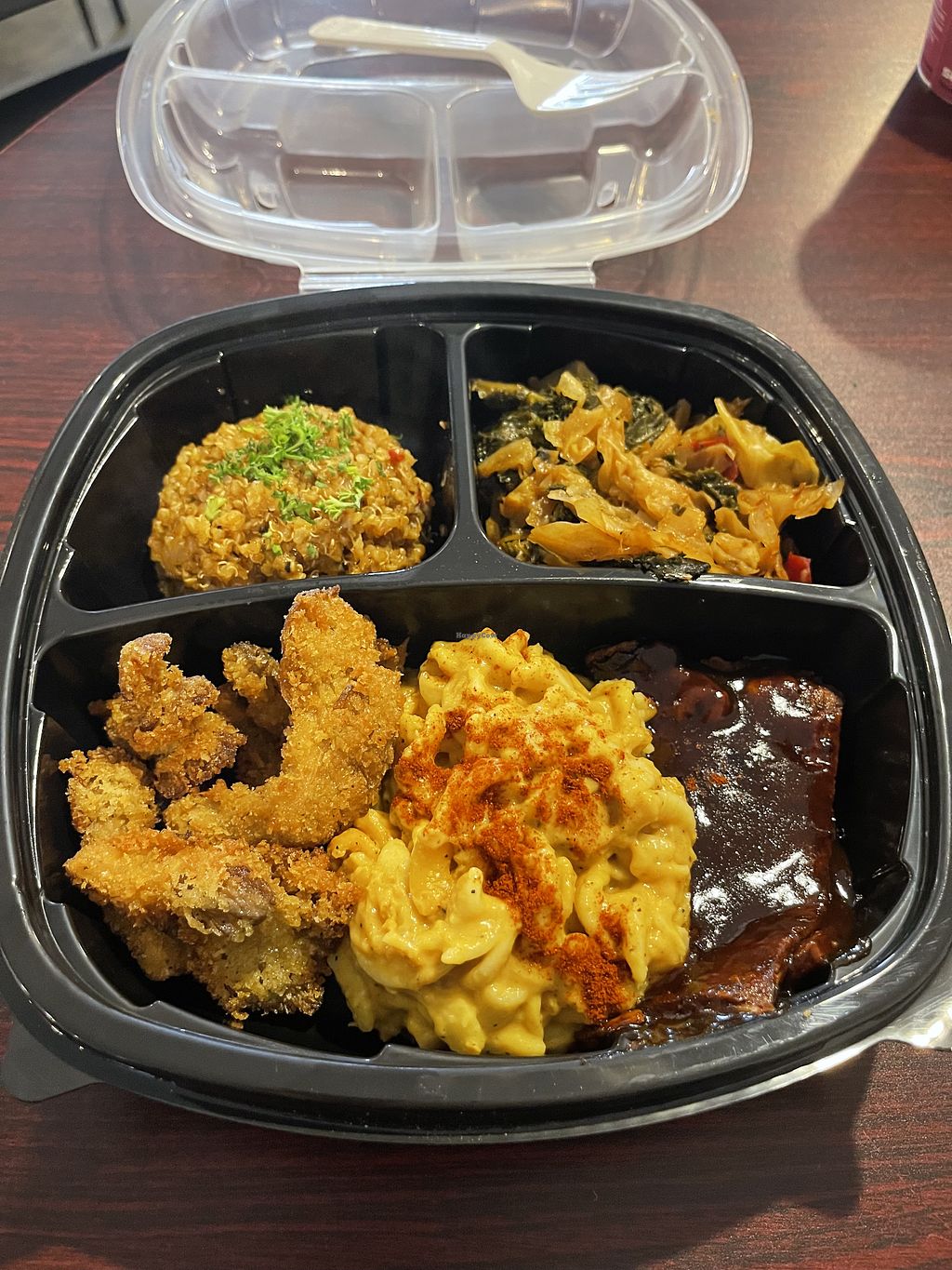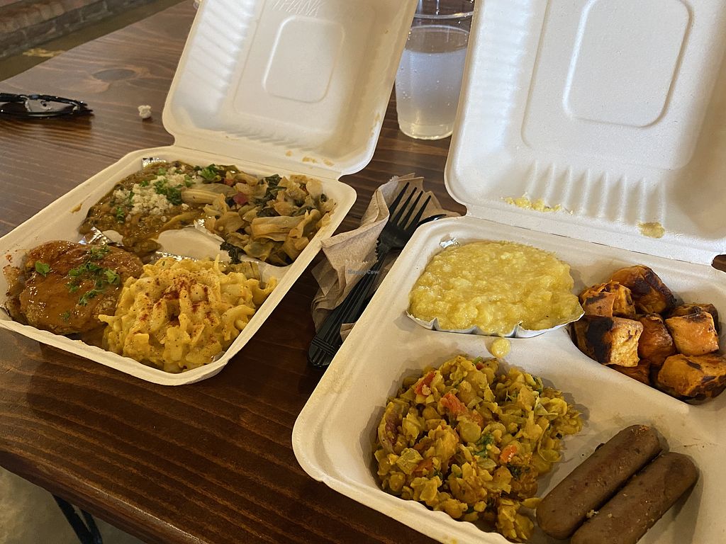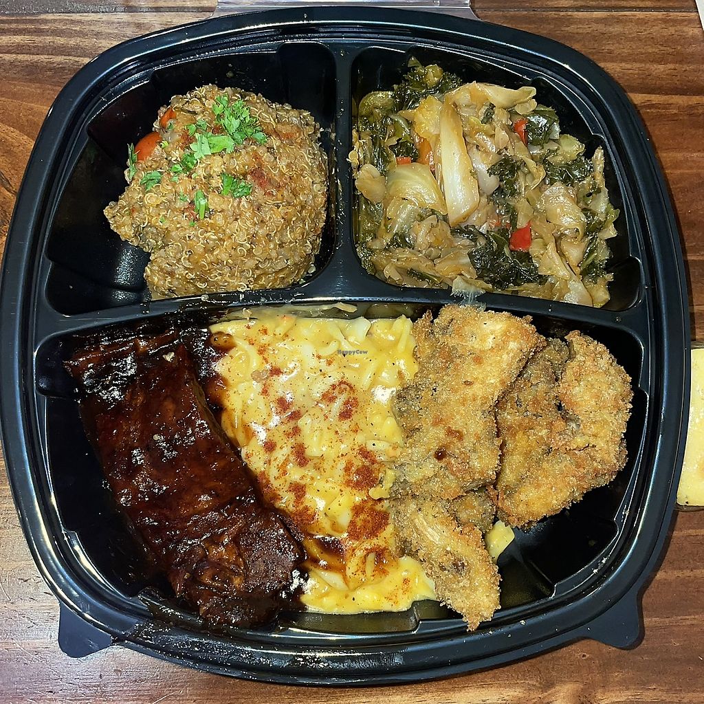 Top: jambalaya - Collard Greens Bottom: Oysters - Mac - Jackfruit BBQ