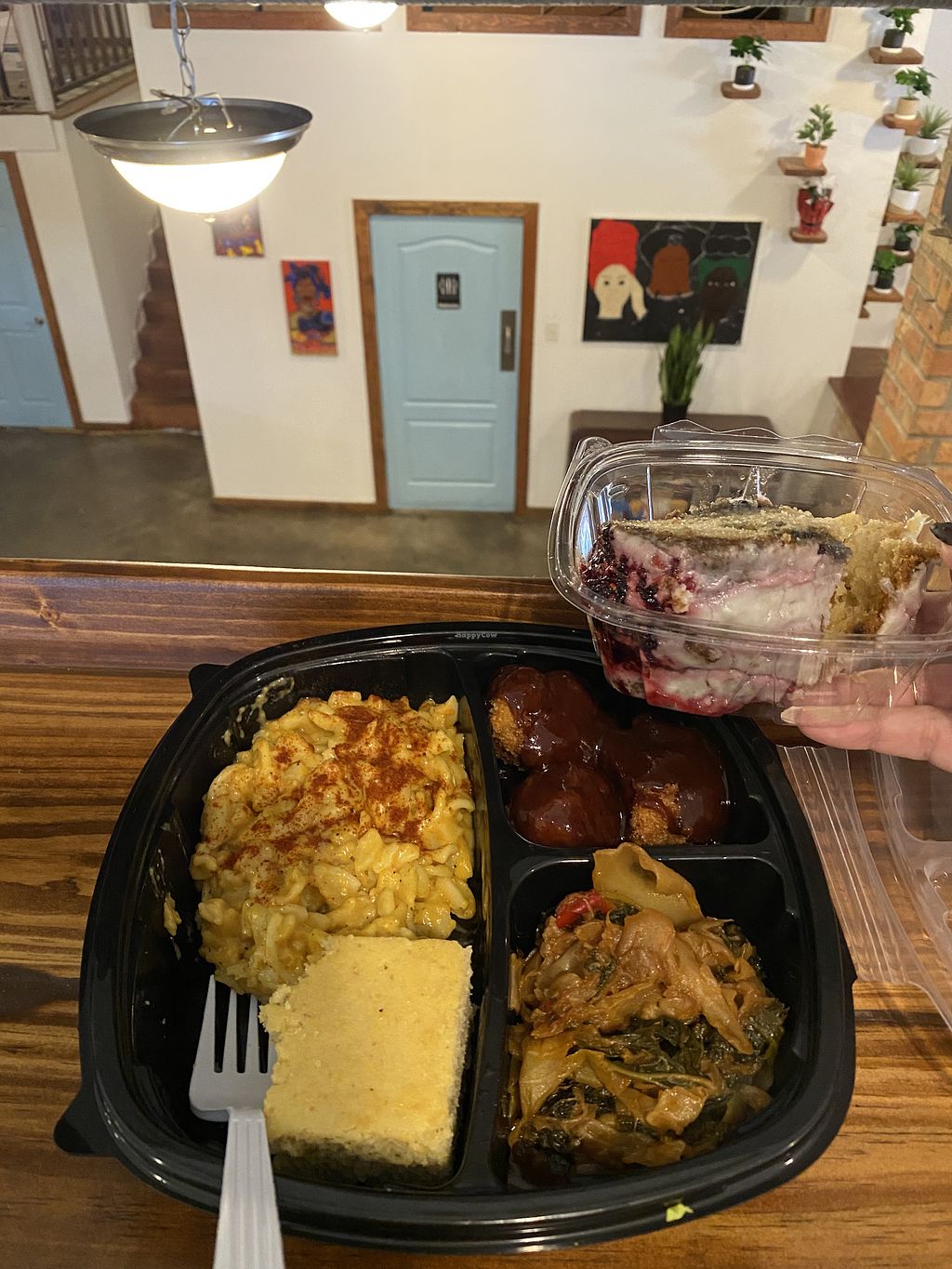 Vegan Mac and cheese, corn bread, cauliflower wings, greens!