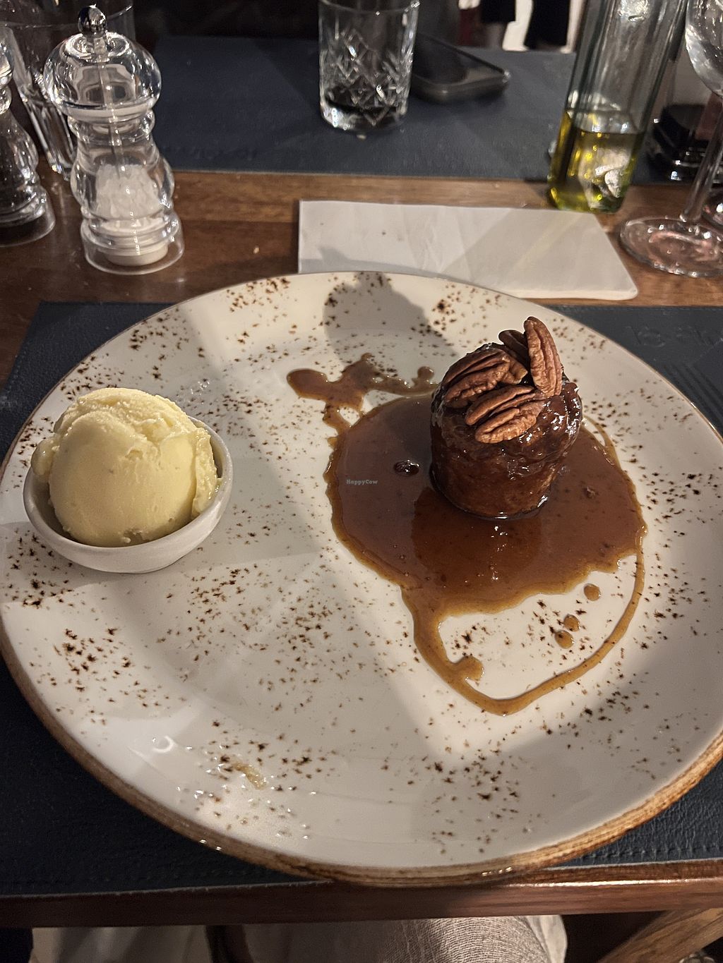 This restaurant was picked by my sister in law and because I couldn’t find the menu online I was skeptical. We were surprised with several decent vegan options. My partner and I shared the Linguini which was INCREDIBLE. The main size was perfect for us to share and then we were also given roast veg & potatoes bread for the table which was so nice and yummy too. For desert we shared the sticky toffee cake with vegan ice cream which was 10/10. Our non-veg family members also really enjoyed it. It was a beautiful restaurant, great service and the sunset view was spectacular!