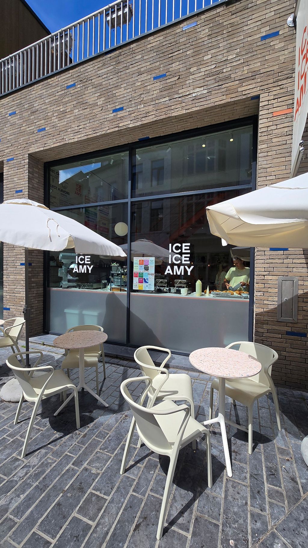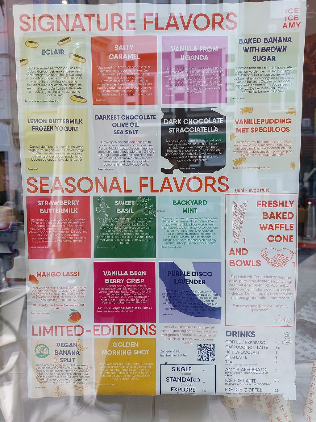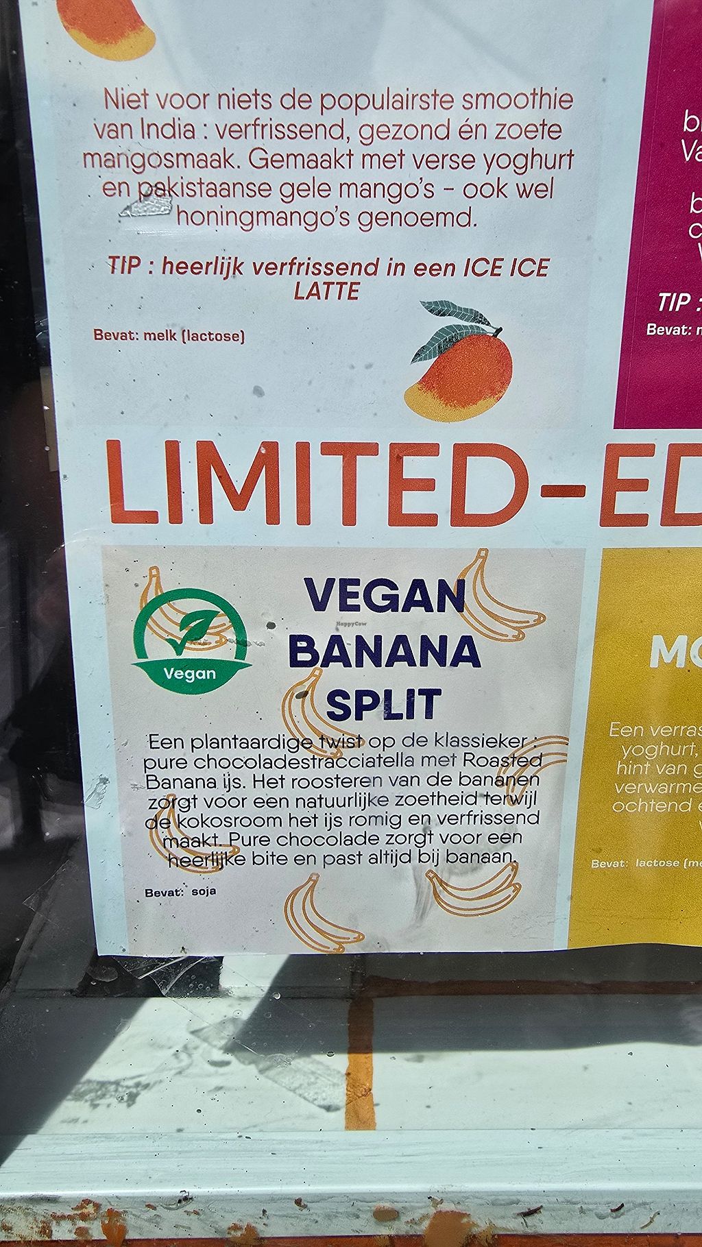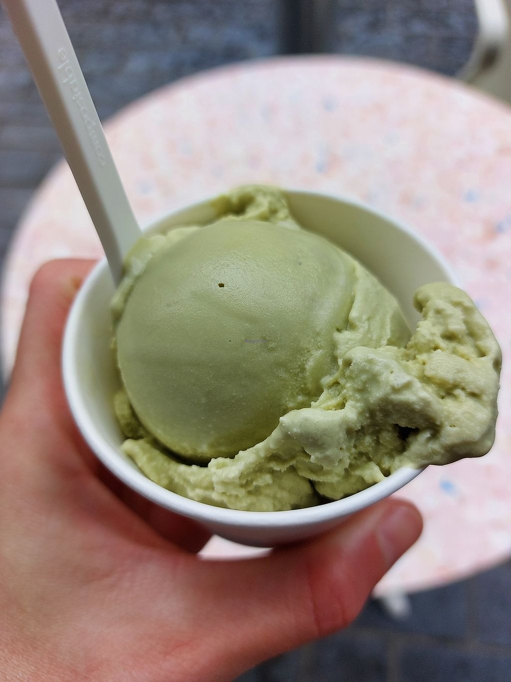 They offer 2 vegan flavours: coconut matcha (not labeled on their menu) and banana split. The banana split was sold out at the time I visited so I tried the matcha. It was very flavourful and delicious. One scoop costs 4€. They make their own cones but those aren't vegan.