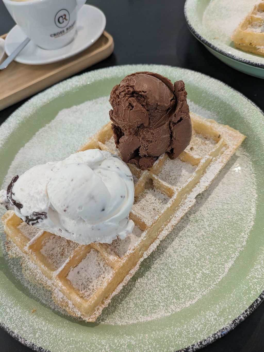 I ended up choosing one scoop of pistachio and one of cheesecake. Both were tasty, and the pistachio especially was rich, nutty, and super creamy. I probably would have tried a waffle or another flavor if the vibe hadn’t been so stressful, but under the circumstances, I kept it simple.