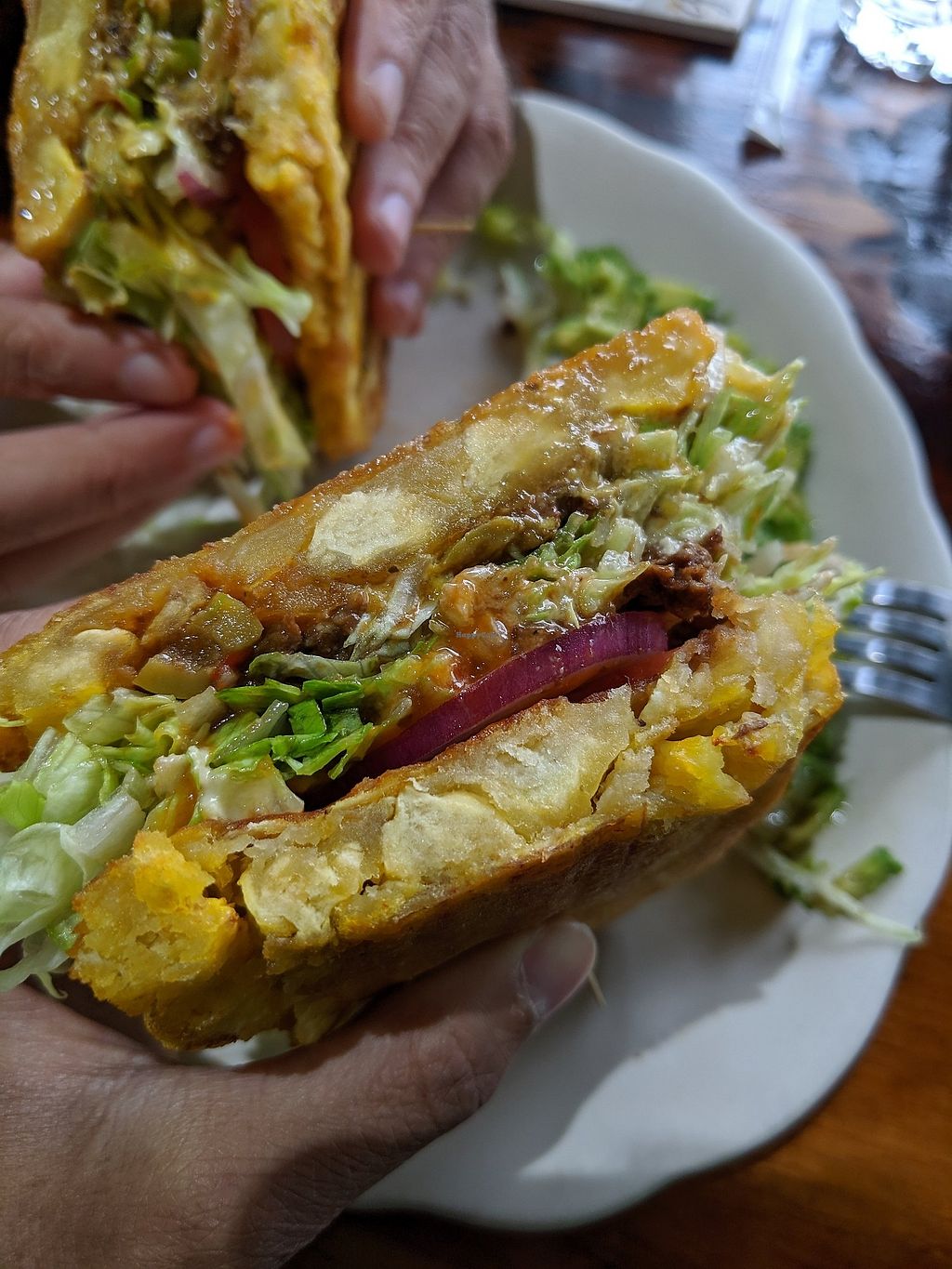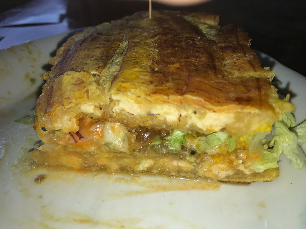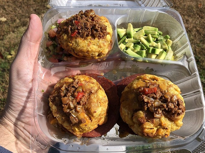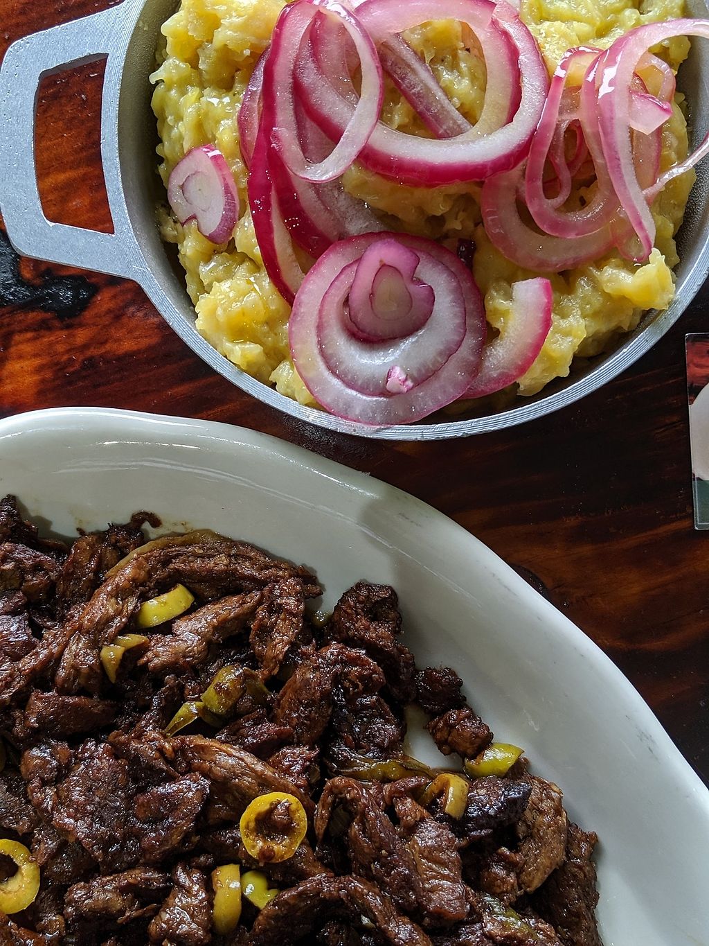 Veggie meats and side of mangú (mashed plantains with pickled onions)