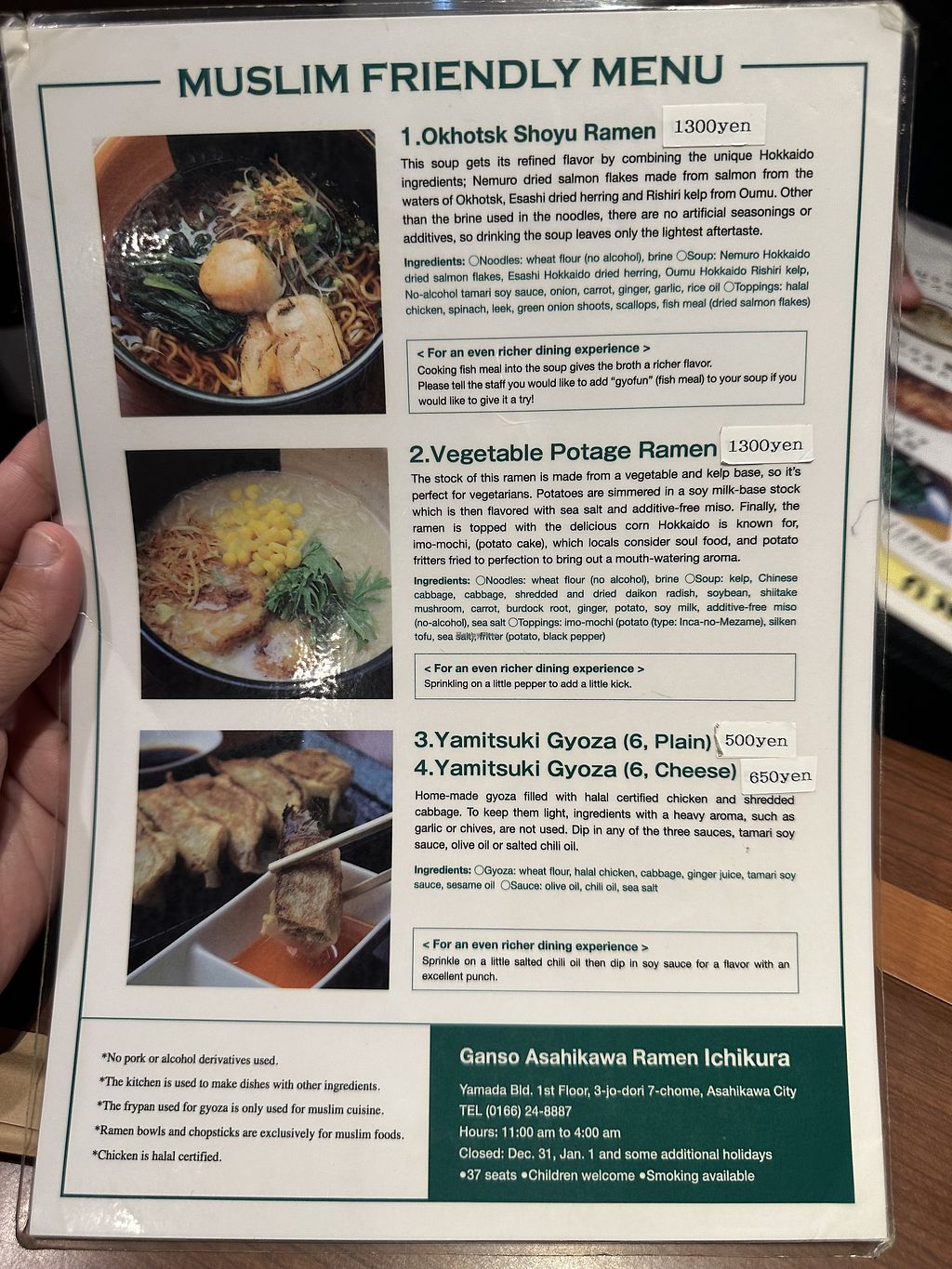 There are 2 vegan dishes here. I had the Vegetable Potage Ramen from the halal menu, on which all the the ingredients are listed. Creamy and delicious. Amazing fried potato toppings. The other option has its own page of menu and clearly says "animal free." It has a miso base. Definitely one of the more vegan friendly places I have been to in Hokkaido.