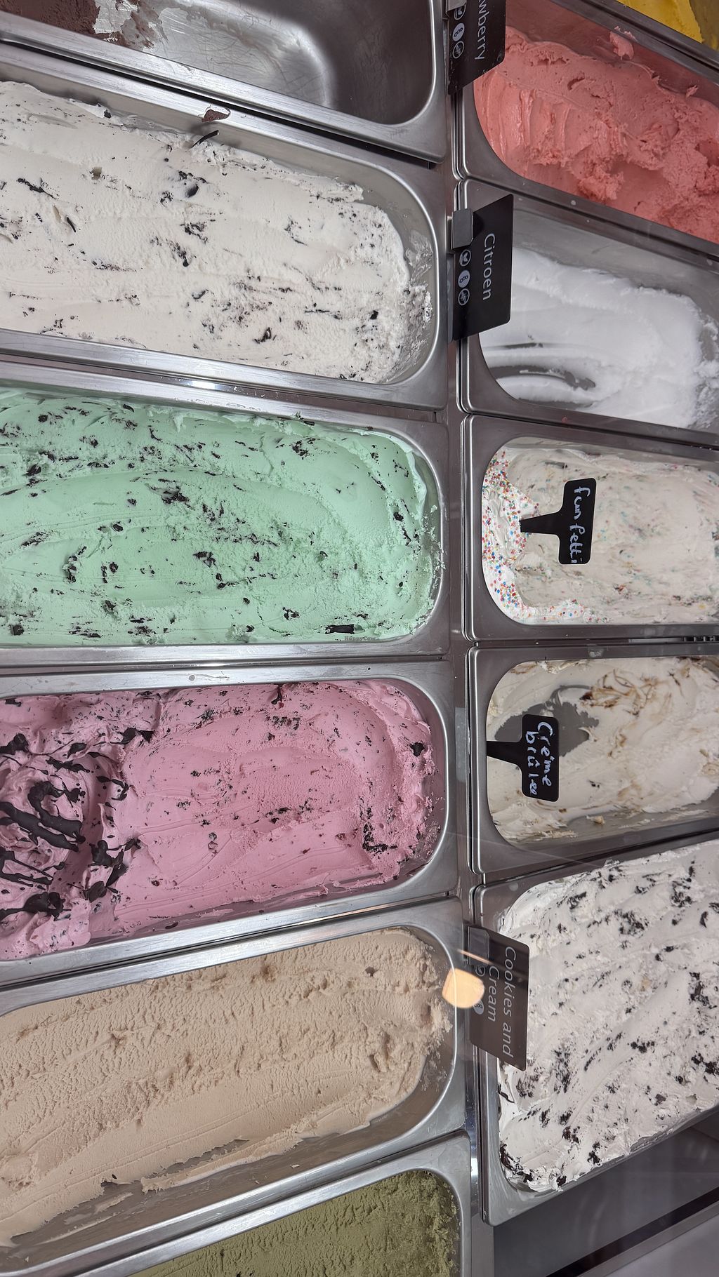 Sehr sehr leckeres veganes Eis. Wir hatten Stracciatella, Erdbeere, Zitrone und Cookies & Cream, alle weiterzuempfehlen!