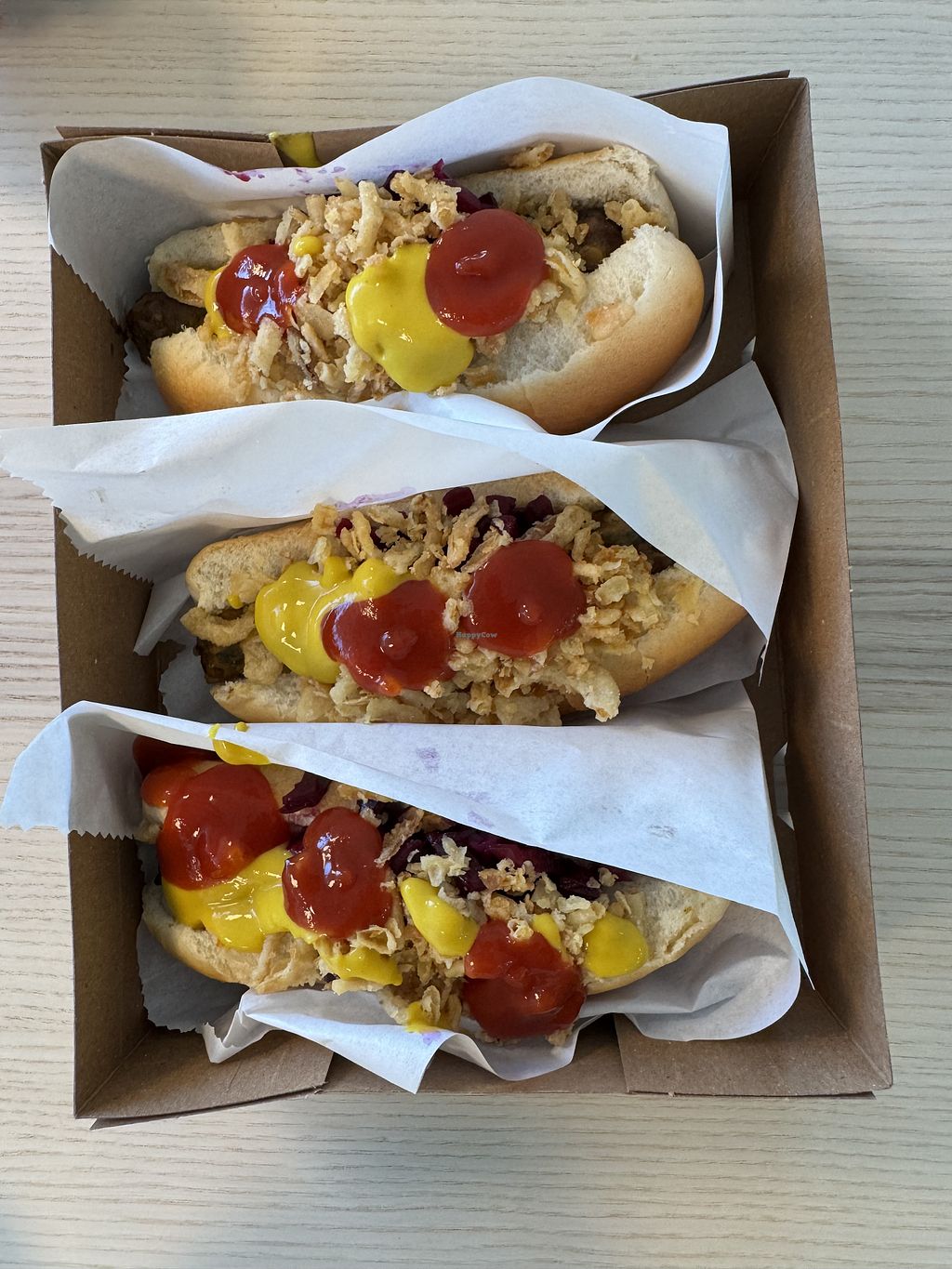 Vegan Hot Dogs with ketchup, mustard and fried onions