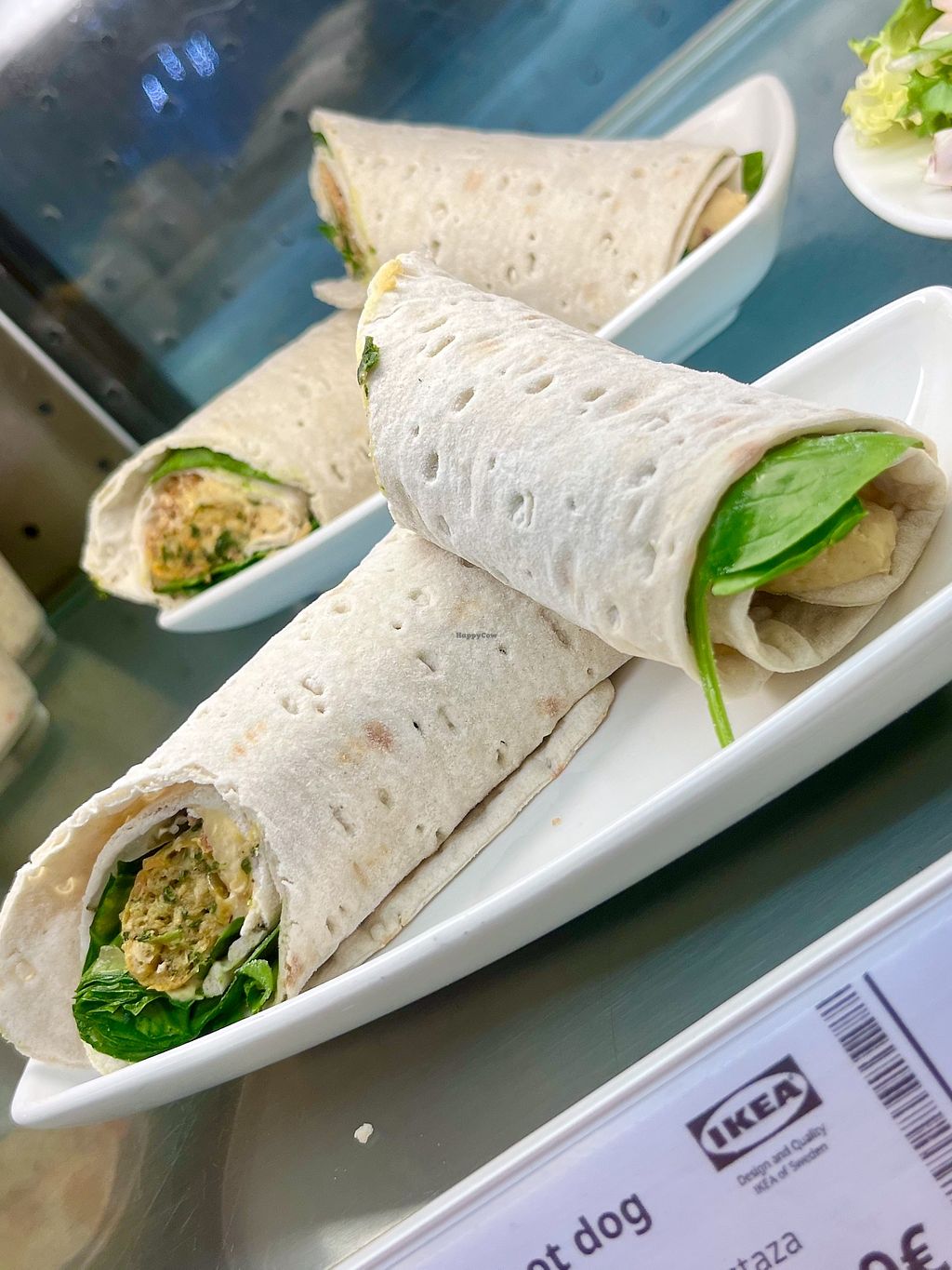 Vegetable roll: roll with plant based sausage, hummus, pickle, fried o…