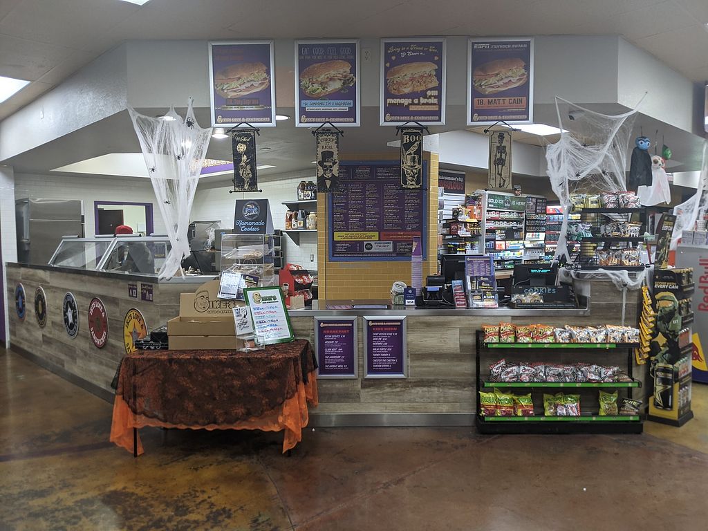Serves meat, vegan options available. Sandwich shop chain originating from the San Francisco Bay Area. Offers a few designed vegan sandwiches as well option for customized ones using ingredients like vegan cheese and mock meats (vegan meatballs, chickn, etc.). Note: mock bacon is not vegan. Open Mon-Sun 10:00am-7:00pm.