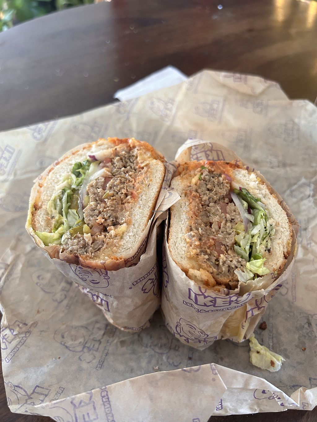 Read moreStuffed with meaty artichoke hearts, buffalo wing sauce, a melty layer of Daiya cheese, vegan fried chicken, shredded lettuce, banana peppers, jalapenos, pickles, and onions on what turned out to be a lovely bubbly crusted tangy sourdough loaf This is the best sandwich I've had at Ike's to date.