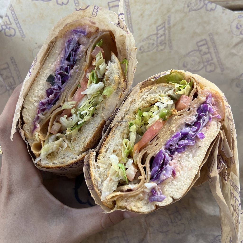 We went to the Torrey Pines location. I had Sally’s Ride with vegan turkey on a Dutch crunch bread. The bread was tasty but a little too much sugar in my opinion. (Tasty Junk food sandwich bread.) Lots of the sandwiches can be made vegan. They have Daiso vegan cheese and a lot of vegan meat.