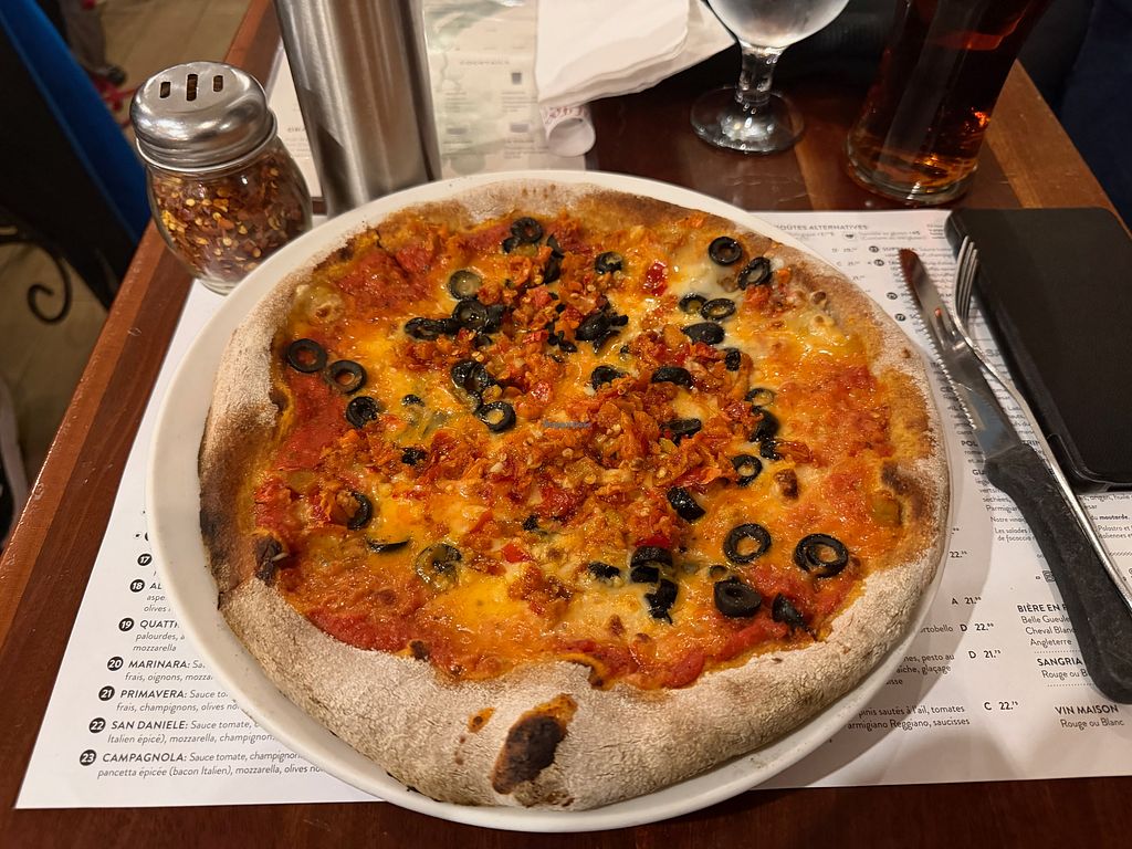 Vegan crust, cheese, artichoke, rapini, olives, mushrooms and vegan pe…