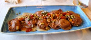 The restaurant has made it onto the 10 Ten on TripAdvisor in Italy, and I can understand why: moreover it offers an extensive vegan menu! A visit in May with my partner was perhaps the best meal I have ever experienced. It was fantastic to see a vegan menu, from which it is difficult to choose as everything sounded delicious! We sat on the terrace on a warm night, and drank some wonderful wines. The Brunello was complex and satisfying. We were surrounded by flowering jasmine with a wonderful view. The meal started with bread and extra virgin olive oil. We were then given a dish on the house - beautiful quinoa and vegetable croquettes. Our starters were legume pates (from the main course menu), with amazing citrus fragrance, and outstanding vegan tempura. The tempura was mind-blowing. Best were sage leaves coated in crisp, thin batter made with spring water. For the main course I had croquettes with a tasty strawberry and asparagus salad, and my partner had a delicious vegan ravioli. We shared a delicious vegan chocolate cake to finish, and I rounded off with a decaff espresso. Food at its best, in an unforgettable setting. We splashed out and celebrated, but it is easy to dine here at reasonable cost. Lucignano is also a great place to visit. I give it 5 stars (outstanding), but my notification button only allows 4 (very good)- bah.