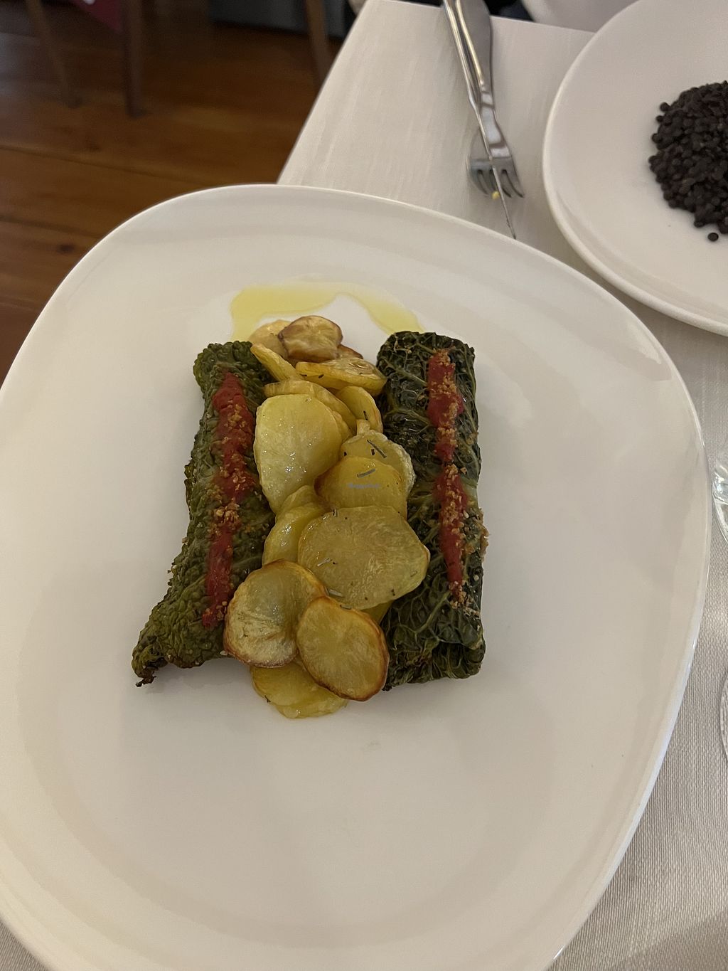 Zucchine ripiene di crema di lenticchie e anacardi su letto di porri.