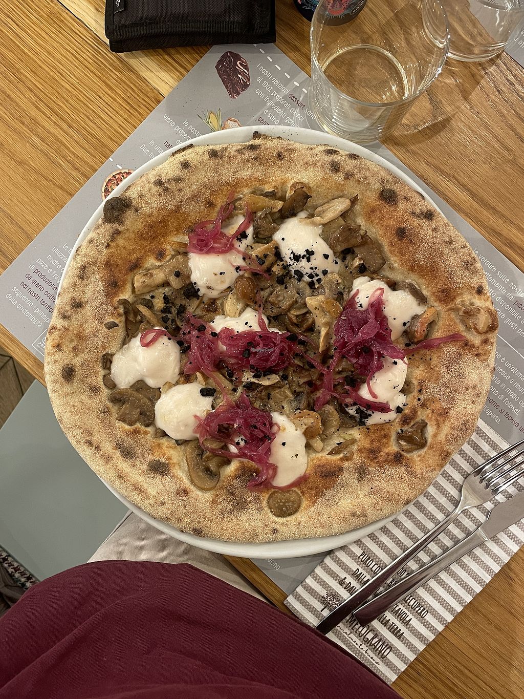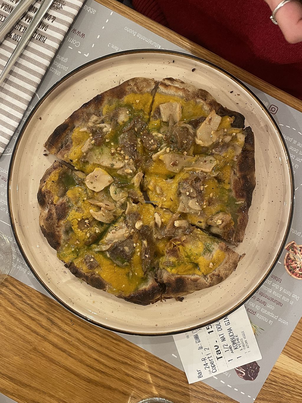 Autumn veggie pizza (mushrooms, caramelized onions, olive powder)