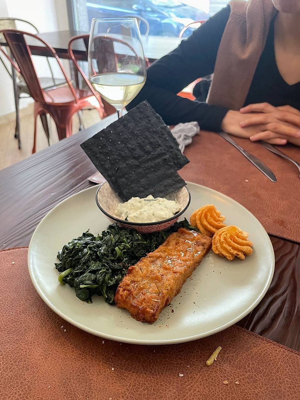 Trancio di salmone con salsa all'aneto e contorno di verdura