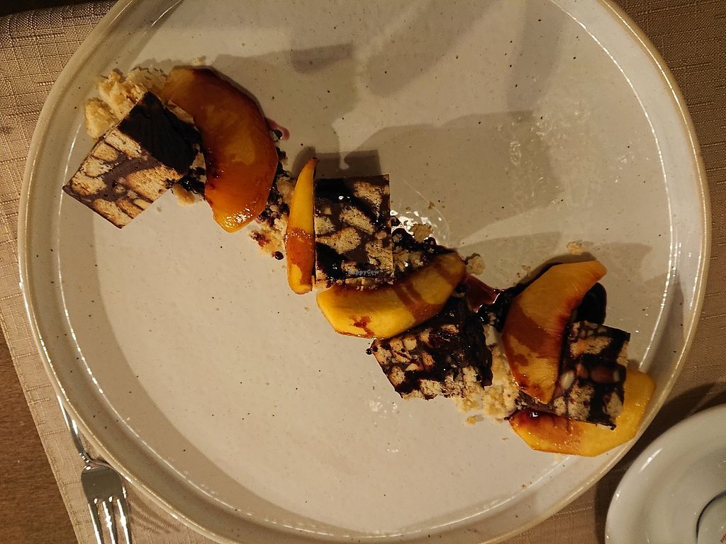 Dessert: Chocolate Salami with peaches and Port wine reduction