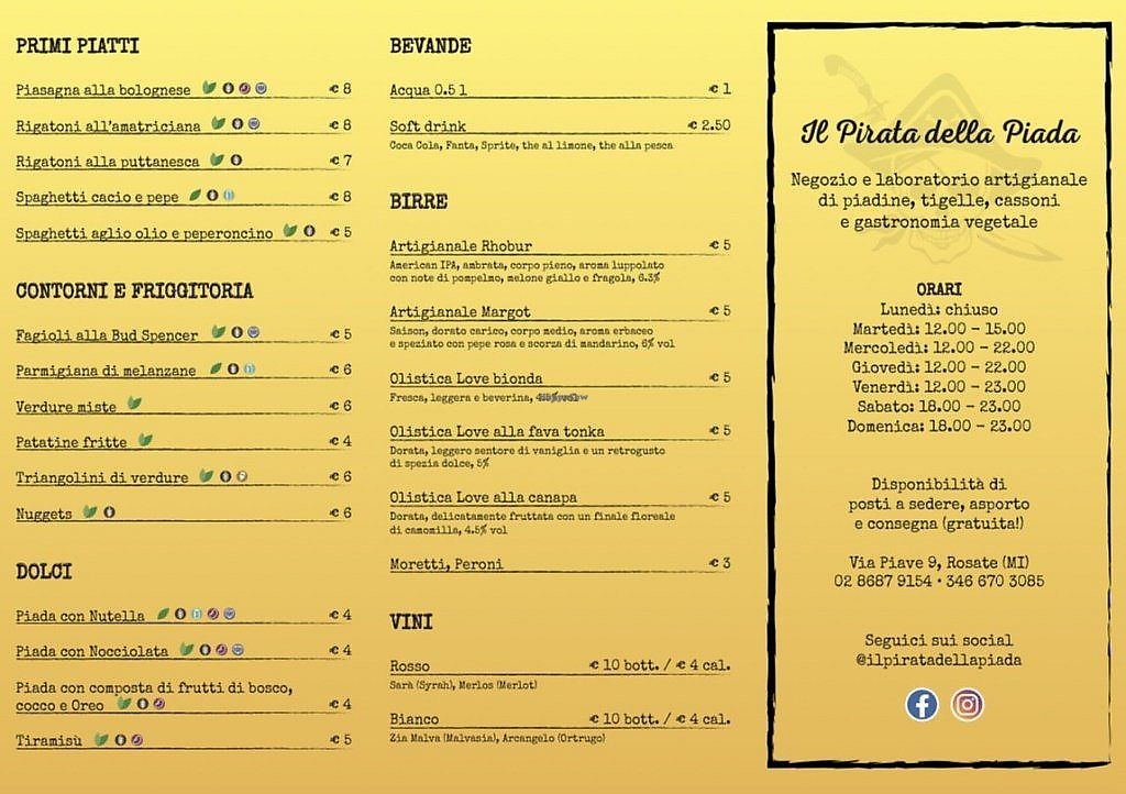 Serves meat, vegan options available. Café offering vegan piadine and cassoni made with local ingredients and vegan filling options. Also accepts Satispay. Open Tue 12:00-19:00, Wed-Thu 12:00-21:30, Fri 12:00-22:30, Sat-Sun 18:00-22:30.