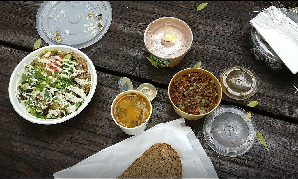No plastic at all now! Wooden bowl for stew and paper wrapped around sandwich. Metal cutlery. Post pandemic is eco friendly